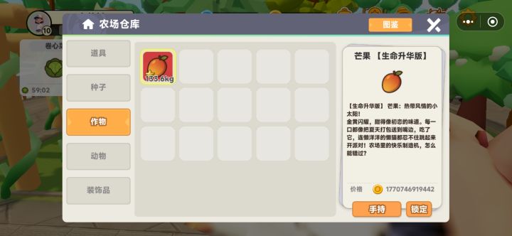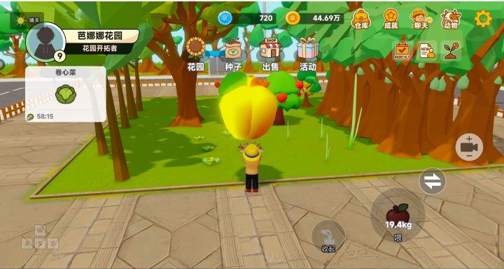 3D卡通画风,界面结构很常规,UI品质一般。色调比较明亮,是个光照很充足的小镇。角色模型材质感一般,有简单的肢体动作,看身形像小孩子,并没有男女显著特征。各种植物模型比较符合现实世界认知,成熟状态差别很明显,理解没问题。