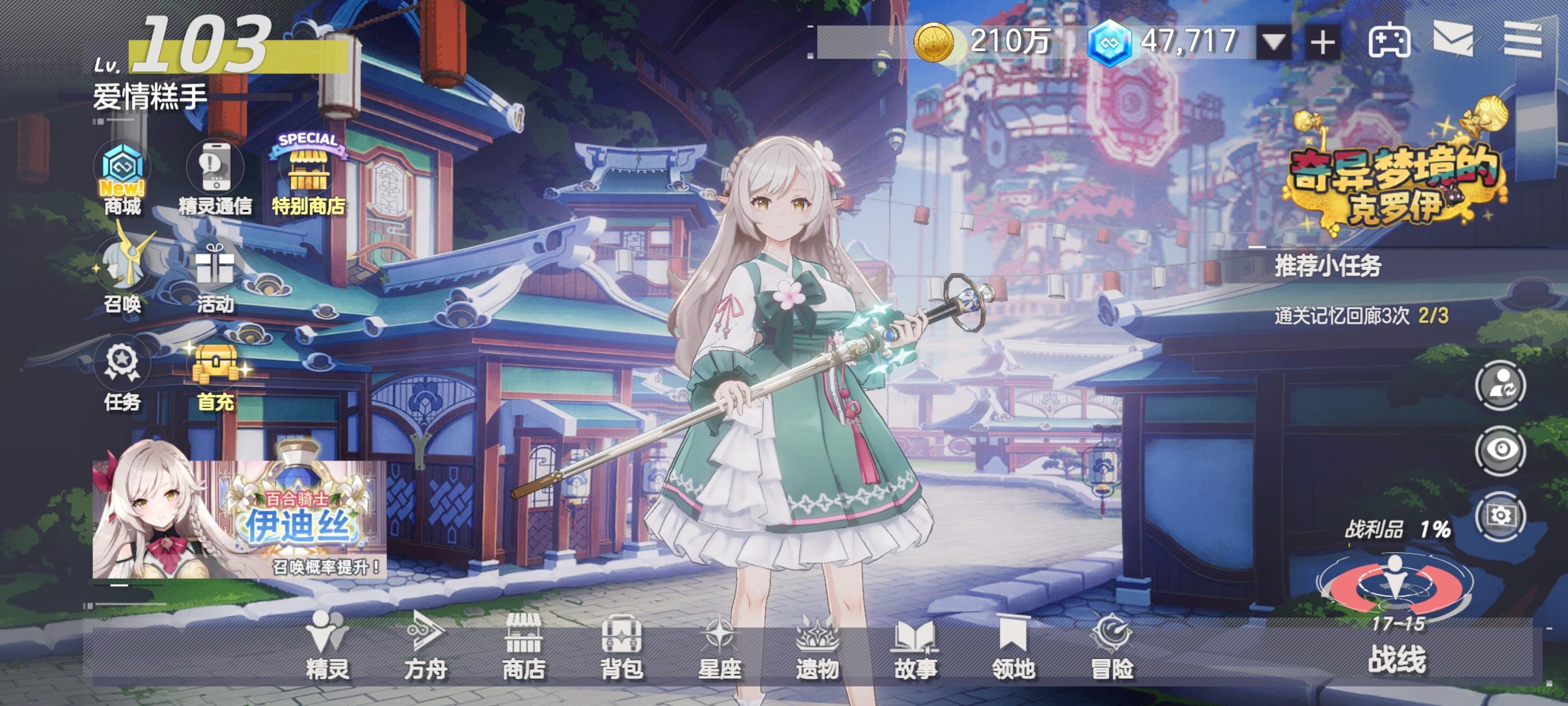 因为最开始玩的号太非了,新建了号第三天才开始玩,也没抽到小天使,所以推图进度比较落后。顺便说一下几个自己的游玩体验。(不一定对)1、新手10连,达芙妮或者伊迪丝选一个开局。如果出了达芙妮,送的4个自选箱子全部选伊迪丝,出了伊迪丝,自选箱子选一个达芙妮前期推图,剩下3个箱子选伊迪丝,达芙妮一只就够了,甚至星级越低她吸收的伤害越多打出的伤害越高。2、推图阵容,最好就是伊迪丝、光辉凯瑟琳、达芙妮、