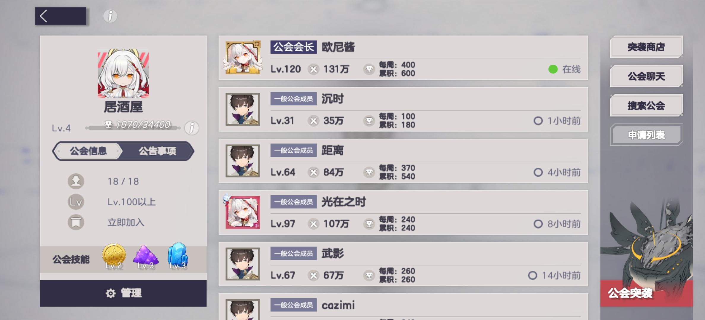 本来我不是会长的,随便加的一个公会,没想到会长第一天就退游了,我一直想换公会,没想到一个星期又一个星期,硬是给我拖成会长了,既然如此就干脆不换了,招几个活跃的兄弟一起玩,公会虽然既没有挂哥,也没有富哥,但活跃就行,每天上线玩玩。到时候我会清理退游玩家,然后招人。佛系游戏,想来就来。