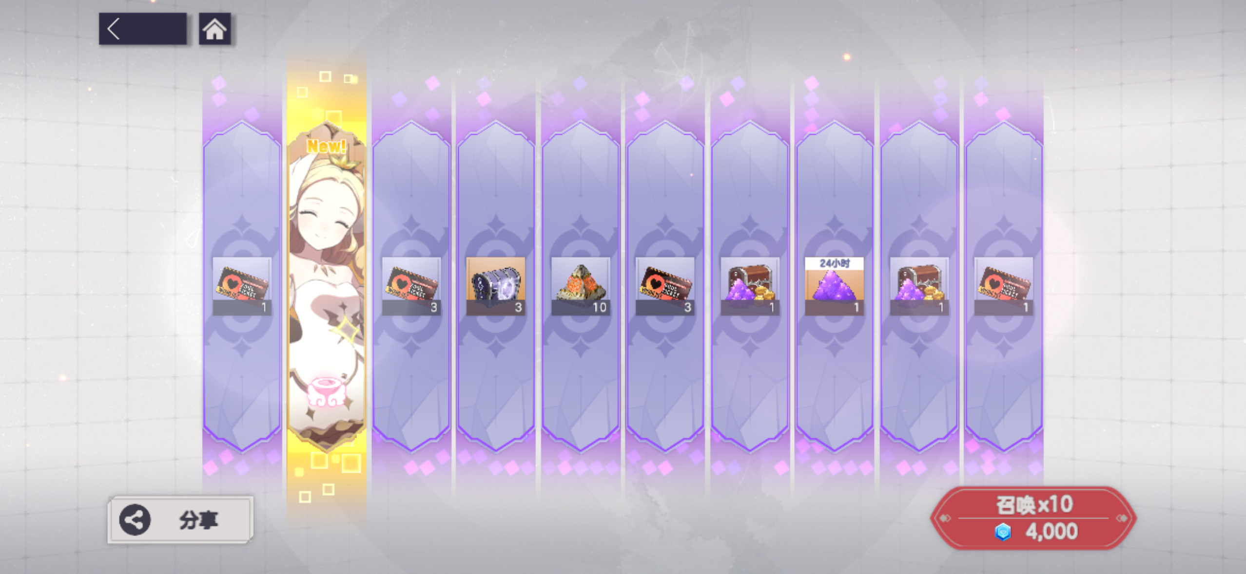 因为最开始玩的号太非了,新建了号第三天才开始玩,也没抽到小天使,所以推图进度比较落后。顺便说一下几个自己的游玩体验。(不一定对)1、新手10连,达芙妮或者伊迪丝选一个开局。如果出了达芙妮,送的4个自选箱子全部选伊迪丝,出了伊迪丝,自选箱子选一个达芙妮前期推图,剩下3个箱子选伊迪丝,达芙妮一只就够了,甚至星级越低她吸收的伤害越多打出的伤害越高。2、推图阵容,最好就是伊迪丝、光辉凯瑟琳、达芙妮、
