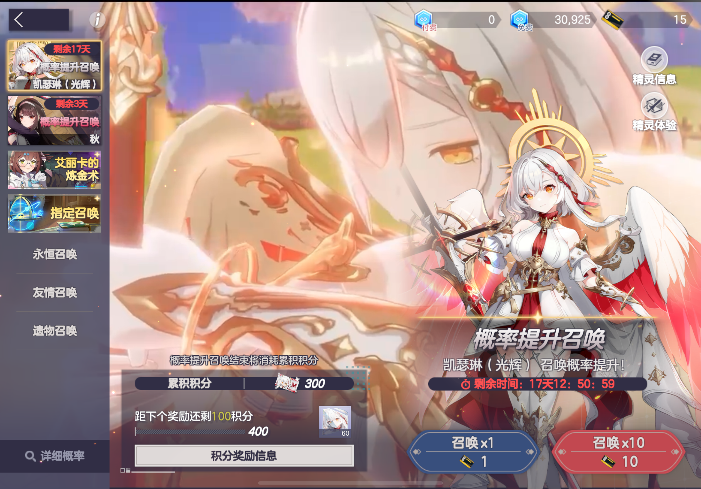 玩了两天了还没开始氪金,300抽一共14个凯瑟琳,刚好到不朽,伊迪斯歪也歪到永恒了,准备开始囤物资屯钻准备下个限定了。感觉比国际服爆率高点。国际服一个角色不朽最少花7w多钻,最多10w过,国服直接6.3w,刚好300抽就不朽了。趁更新去看看后面怎么发展。自选池等最后一天再开尽可能延长时间吧,后面去追和伊迪斯的不朽或者等下一个限定都行。