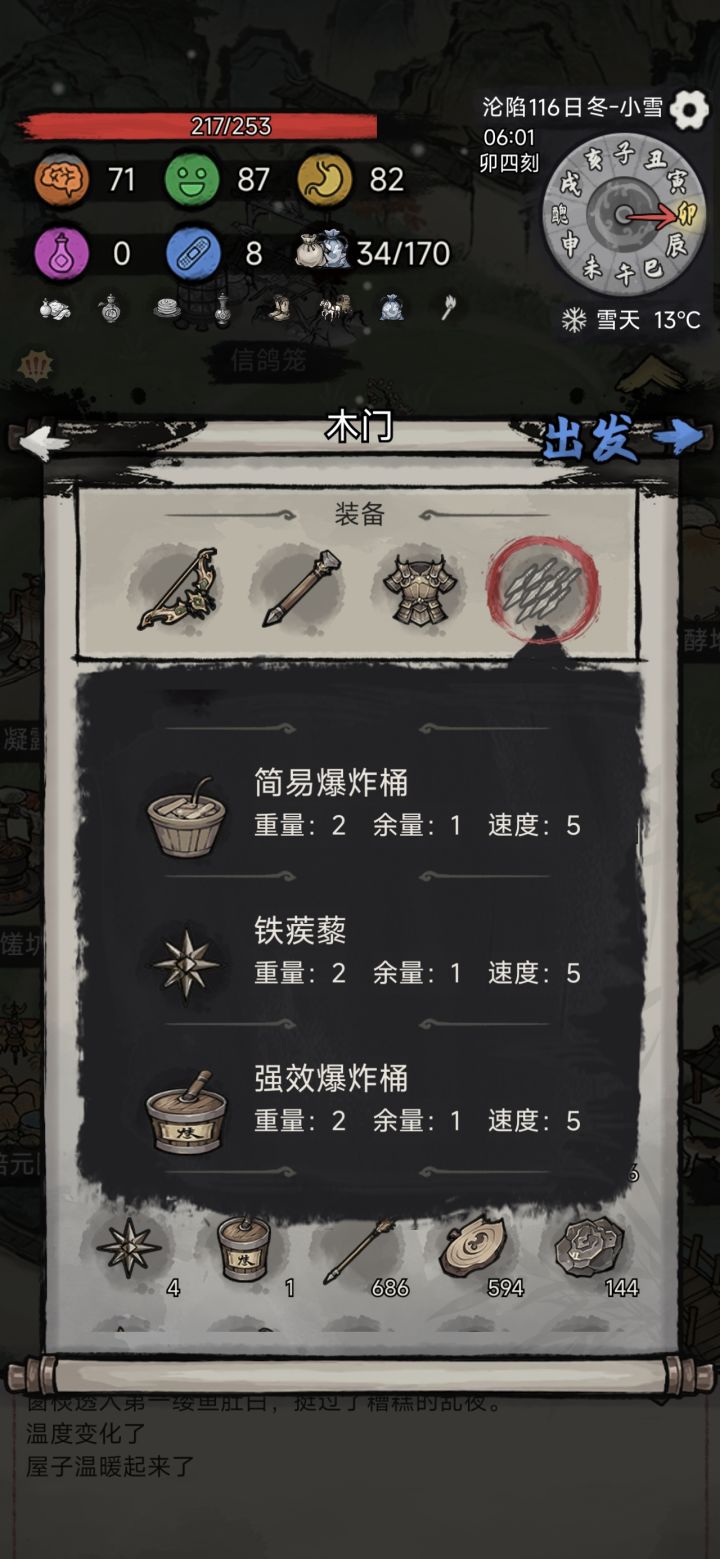 三改:我靠没有炸药,后期真的就被打成筛子了,还是心急了,没有多攒一点炸药。不过无所谓了,也算是看到半个结局了。目前随机性太少了,比较固定,打通一次就没有玩第二遍的欲望了。现在目前感觉像个半成品,装备不够多,冬天温度降低了,除了烧火之外只能硬扛吃药。而且无法中途停止行动,或者在路上换装备,吃东西。不过都是小瑕疵了,还是非常值得一玩的