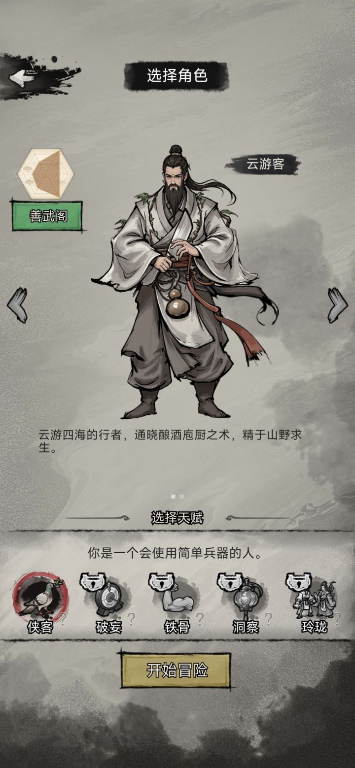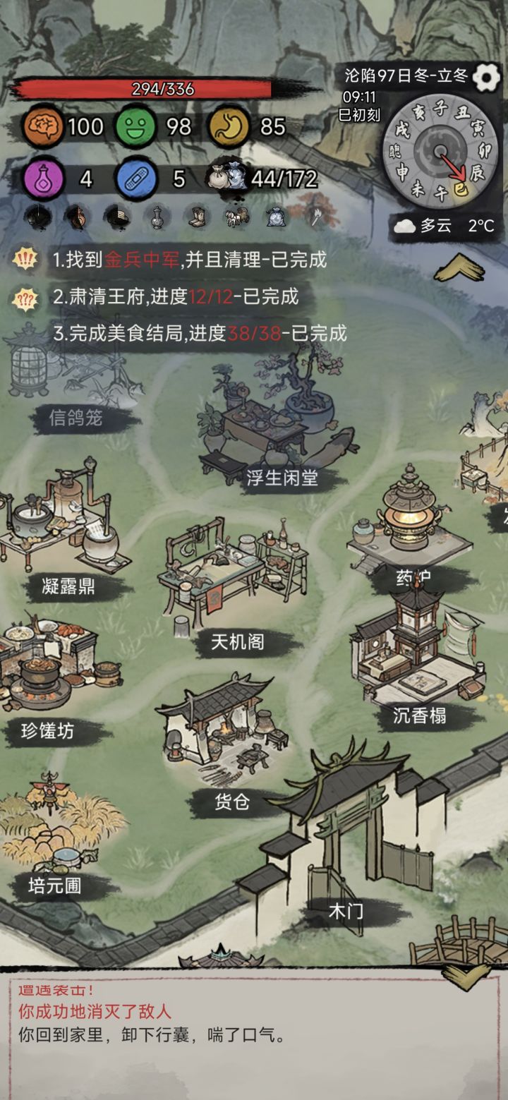 两个结局,一个存档完成了,这游戏主要难在前中期的这个精神跟食物,前期先看那个广告弄那个短弓和箭,食物不够你直接看广告弄食物,反正你这些广告,只要是你第一次玩都要看的,因为到后面大小行囊,军鞋都要广告点解锁,开局天赋也都差不多,我直接用侠客通关。然后等到开了寺庙之后去弄那个寺庙,会有大量的短剑,合成长剑,有了长剑之后就可以不用短弓了,然后去监狱把百晓生解救出来,百晓生解救出来,交易理智药和饥饿药简直