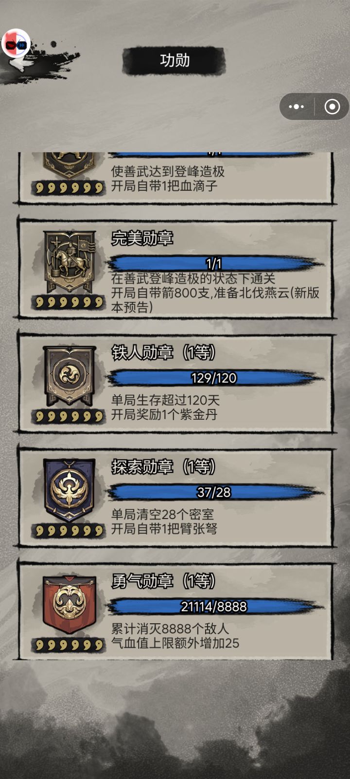 图二三是通关剩余资源供参考。此游戏主要难在前中期,一旦坚持到百晓生解锁就是另一个游戏了直接起飞。✔开局:我开局选的资源+10%,用了官方两个兑换礼包,在打到寺庙之前就靠基础弓箭去过关(资源紧缺没必要单独花铁块去做低级近战武器,弹药不够了就看广告),直到寺庙解锁了直接去拿断剑做出长剑。资源优先升工坊拉到满级,其次桥,然后睡铺,锅灶。其他都可以等中后期资源充足再解锁和升级。工坊优先做出长剑,铠