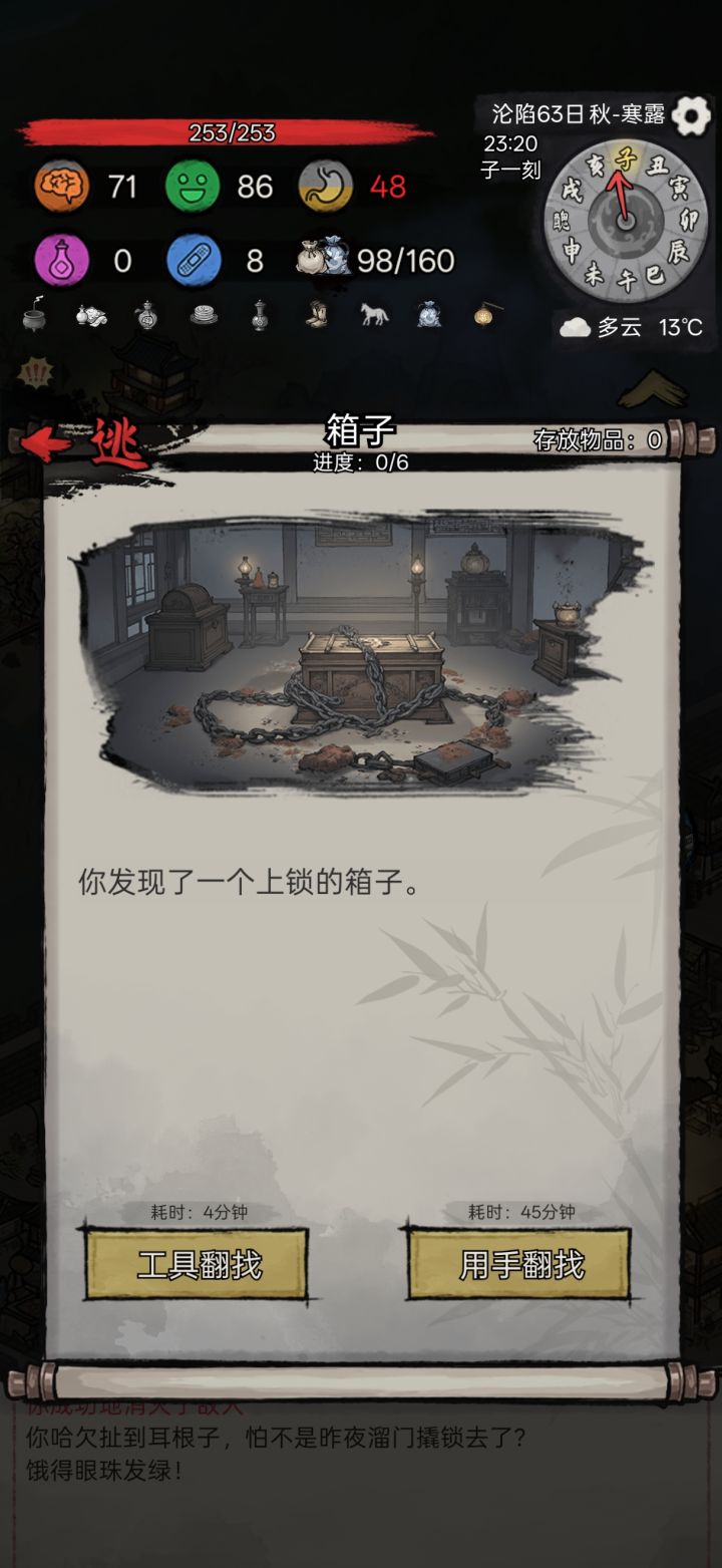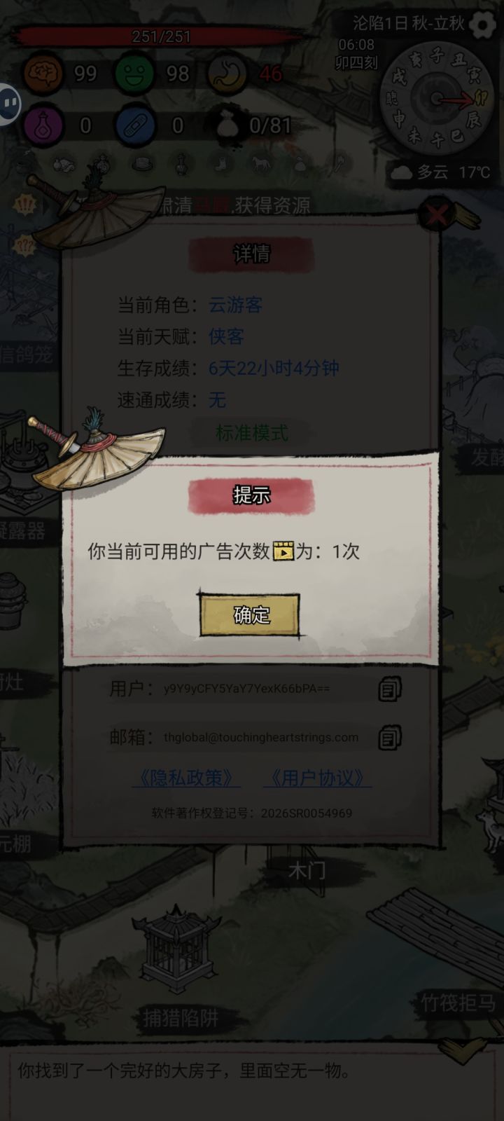1、刚开始玩的萌新,广告该看就看,需要点数在商店解锁新内容2、饥饿值建议不要低于50,不然心情会掉得很快,饥饿值过低会出内伤,冬天天气冷也会出内伤3、上面那个背包图标是可以点的,在野外可以点开吃东西,所以在家饥饿值还很高,跑一趟去目的地就饿了,出门前可以带上食物,同理可以带上药4、路上随机刷新6级以下小怪,一趟路程最多遇两波,随机出任何武器物资,该打