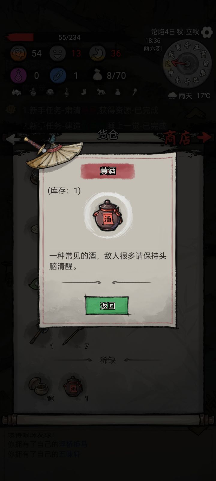 建筑优先升级:沉香席~天机楼~天机阁~休闲桌~犬舍~竹筏拒马~浮桥拒马~沉香塌~休闲台~拱桥拒马~浮生闲堂,其他建筑后面资源充足再升级,把拱马升级了家里游戏时间0点损失东西少军鞋,大行囊,小行囊,双骑马车,灯笼这些道具只生效一个,所以不要打造多了浪费材料当你有了大小行囊后就可以跑图收资源了,带两把长剑(地图寺庙掉落断剑,在天机阁打造)出门就行,因为路上可能会遇到怪。当你把某个地图通关并且把物品