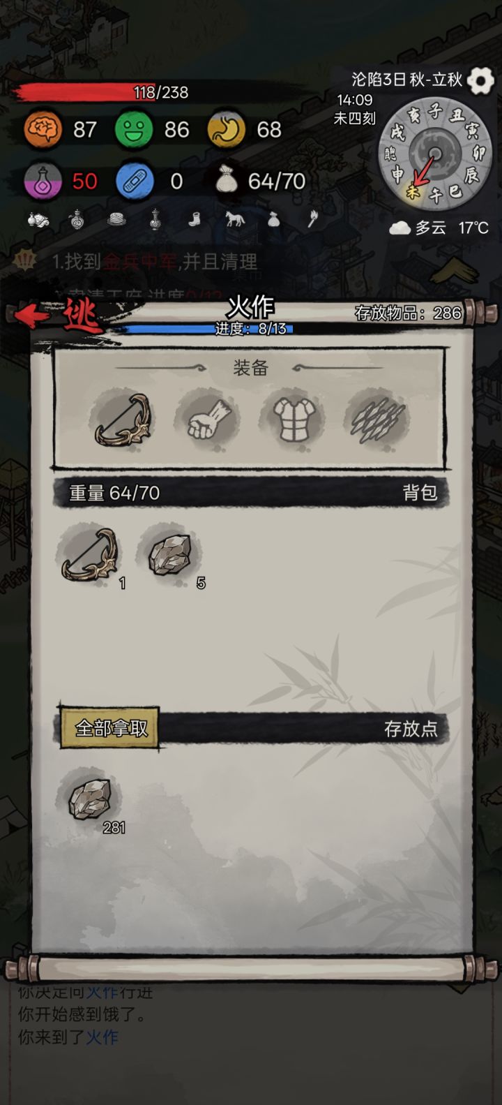 开局最缺的就是食物,用礼包码(happy2026 help2026)能有效度过前期。设备优先升级问题:个人感受 工作台>床>厨房>桥>捕猎器>水=茶摊,(犬舍个人没解锁,和桥用途差不多)剩下的几个设施只能说是锦上添花,最上面的鸟笼没用,个人亲测10次出一个木头(可能是黑)。NPC:个人感受 唐门>=伐木工>白蛇>酒蒙子。(看个人,我喜欢用血滴子,而且茶摊产出很多)地图探索:寺