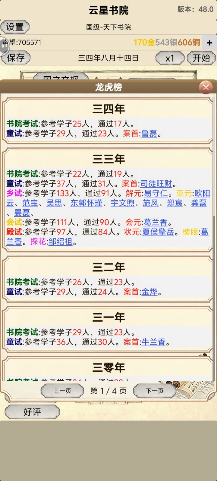 官方古代书院模拟器 : 感谢您的反馈和建议,关于收益,设计之初就是为了让学子去参加考试,所以考中后有大额奖励,其他的建筑功能主要都是为了给学子增加属性,银两收益是次要。入仕系统第一版已上线,后续还会逐渐完善这个功能。