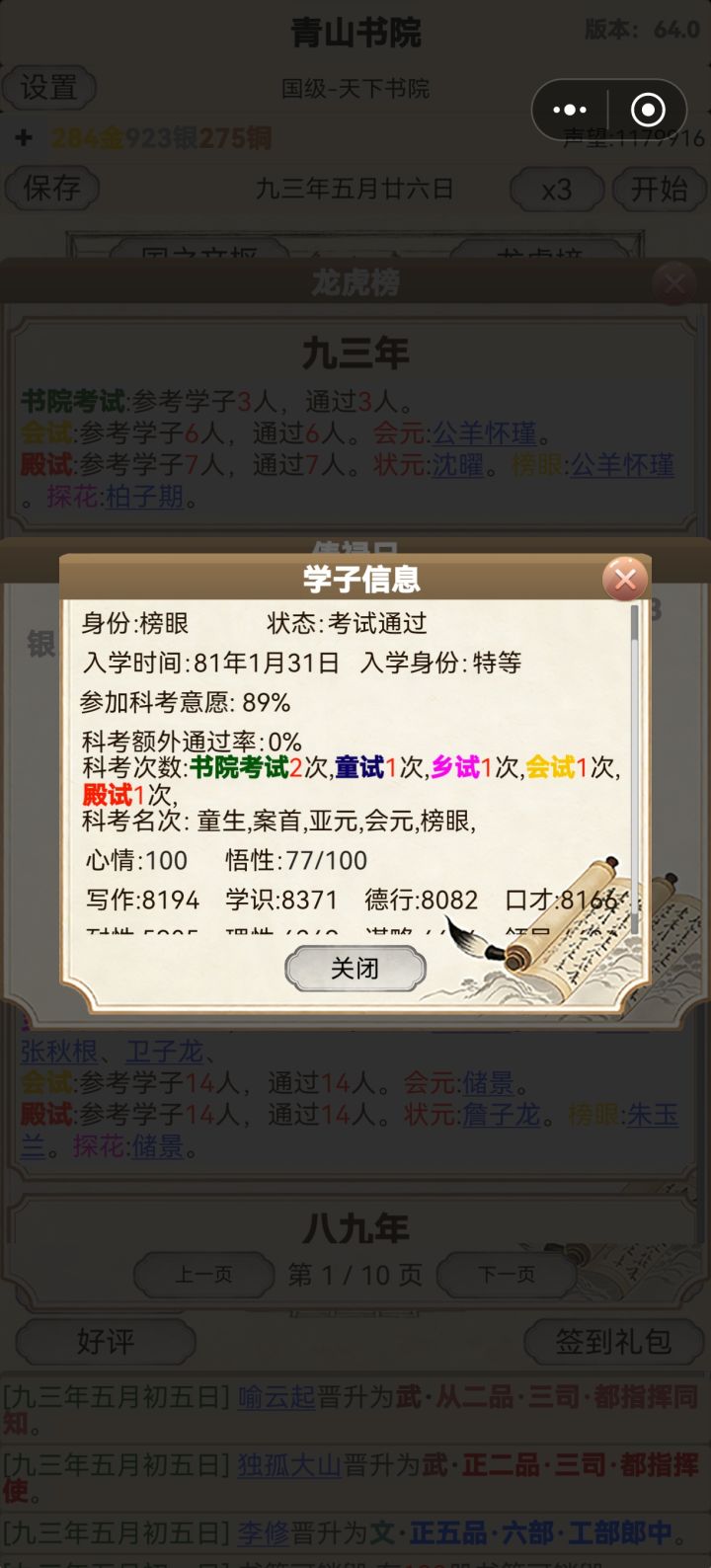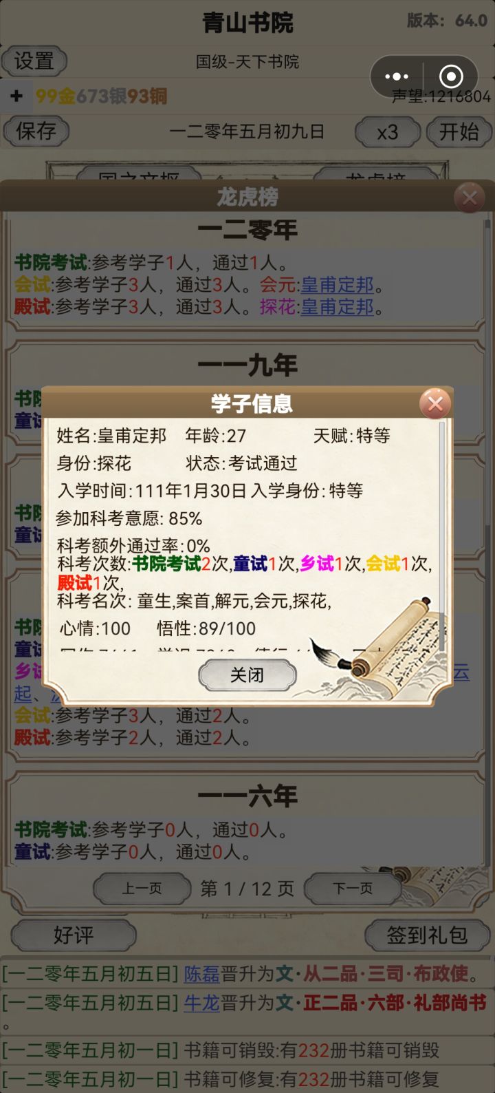 官方古代书院模拟器 : 感谢您的反馈和建议,关于收益,设计之初就是为了让学子去参加考试,所以考中后有大额奖励,其他的建筑功能主要都是为了给学子增加属性,银两收益是次要。入仕系统第一版已上线,后续还会逐渐完善这个功能。