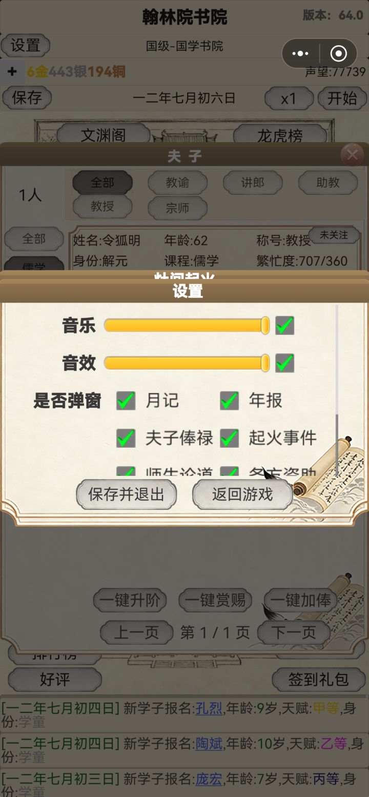 开局选择难度尽量选10金的前期我们缺钱,所有弟子照收不误老师我们定向选择,开局只需要招几个儒学与文学的便宜老师课程安排我们就尽量平均分配,对于出现更晚的科目稍微照顾点,防止偏科放榜之后领钱,升学,留级一条龙,升学留级都会交学费,不能放过此外,住宿与食堂也可以来钱,前期没钱就多收点,后期开最低档关于事件选择,凡是有利于学生的,都按顶格来;凡是有利于夫子的都取消不干除了教学之外,书籍也是