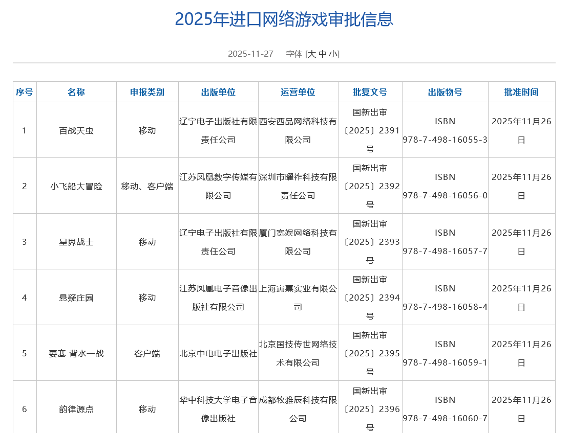 官方于11月27日公布了最新一批游戏版号审批结果,包括百战天虫在内的6款进口游戏过审(名单见2)百战天虫这款童年回忆游戏过审了哈哈,记得以前在电视上经常看有关这游戏的节目,对于一直没能实际体验游戏抱有一点小小的遗憾,游戏过审了看来未来有机会在手机上体验了哈哈。#主机单机 #游戏资讯 #百战天虫 #11月游戏版号出炉