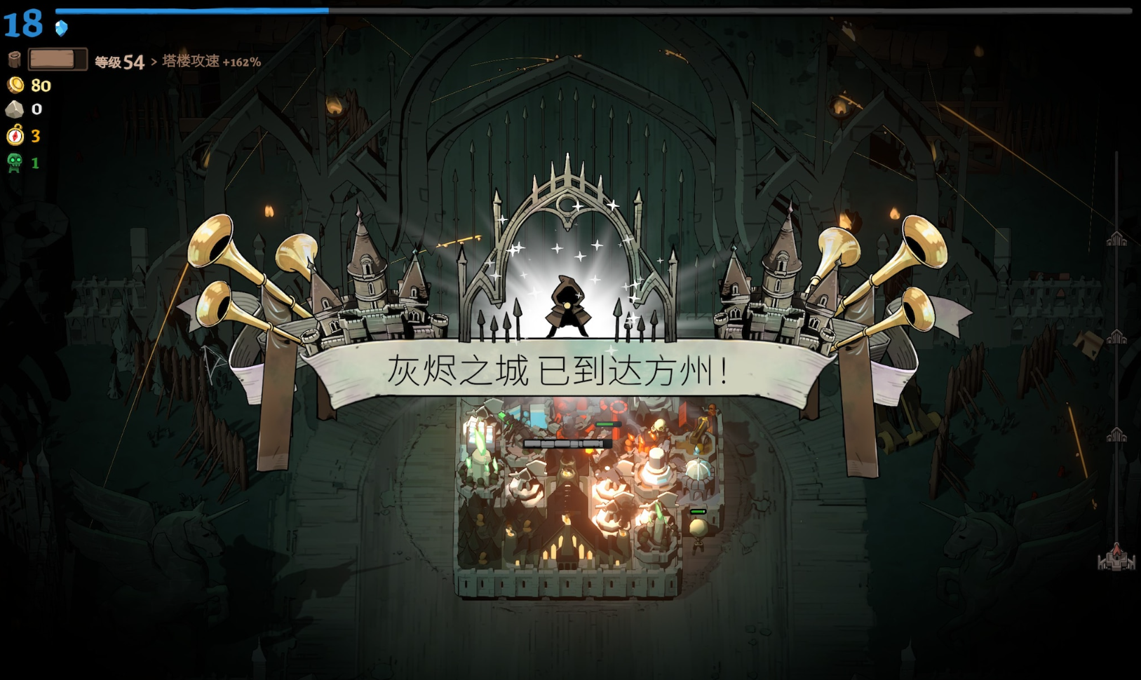 游戏通过可以让我们操控小人,来主动地加入到城堡的发展建设当中,很大程度上增加了游戏所带来的交互感,就像是我们亲身投入到这场冒险中,在城堡移动的道路两旁都是各种随机产生的资源物品,我们要通过近战攻击来采集再运回城堡里,有时还有遇到可以采集的宝箱,从中可以获得小人额外的攻击技能。或者不小心触发敌人的陷阱机关,直接从地底下冒出大量的怪物,被吓得赶快跑回城堡里呆着,亦或者可以在休整点单独外出去尝试获取一些额外的资源来补贴城堡的开销,就真的全心全意的为这个小城堡而努力,看着它一点点变得雄伟起来有种莫名的成就感。