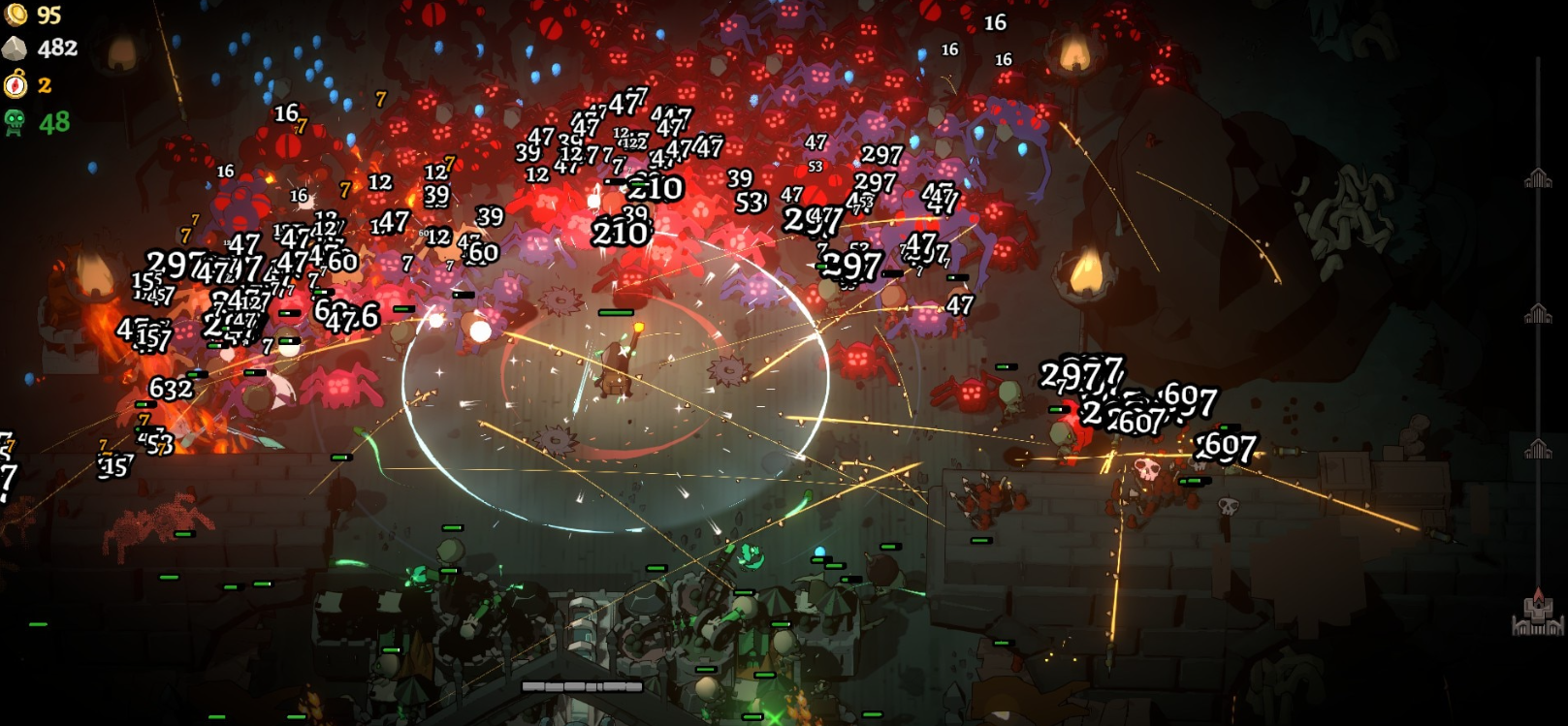 这是一款挺有意思的独立游戏,幸存者玩法搭配肉鸽建筑,感受怪海在身后紧追不舍的刺激,有些时候还要因为前往被树木石头资源堵住城堡移动,马上火急火燎地跑到前面去清理,游戏整体的节奏稍快,但是难度并不会太高,还有额外的局外养成内容可以帮助新手玩家更高地体验到游戏后期新内容的乐趣,特别是最后打BOSS的环节,真的代入感十足,值得尝试一番。