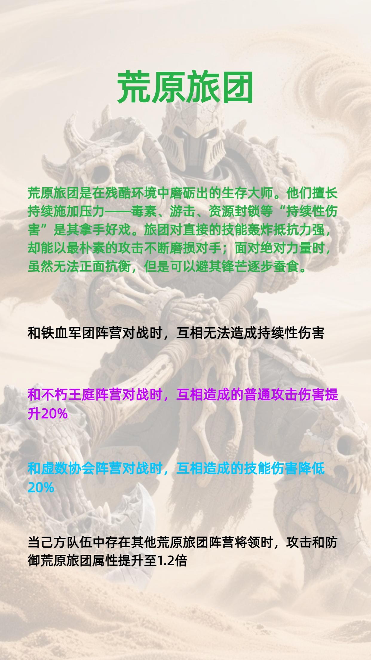 正式版本中,武将将新增阵营特性,并且调整获取方式。武将的刷新将指定品质进行刷新,省去了测试版中反复刷新武将所耗费的时间,同样,品质越高的将领价格越高。不同阵营的武将仍然可以互相作为进阶材料,以控制培养成本所有武将共划分为四个阵营:铁血军团,不朽王庭,虚数协会和荒原旅团。四种阵营风格迥异,在互相对战时将展现出不同的特性。铁血军团崇尚以绝对力量与直接碾压推动文明进程。他们相信历史由最坚硬的金属与最