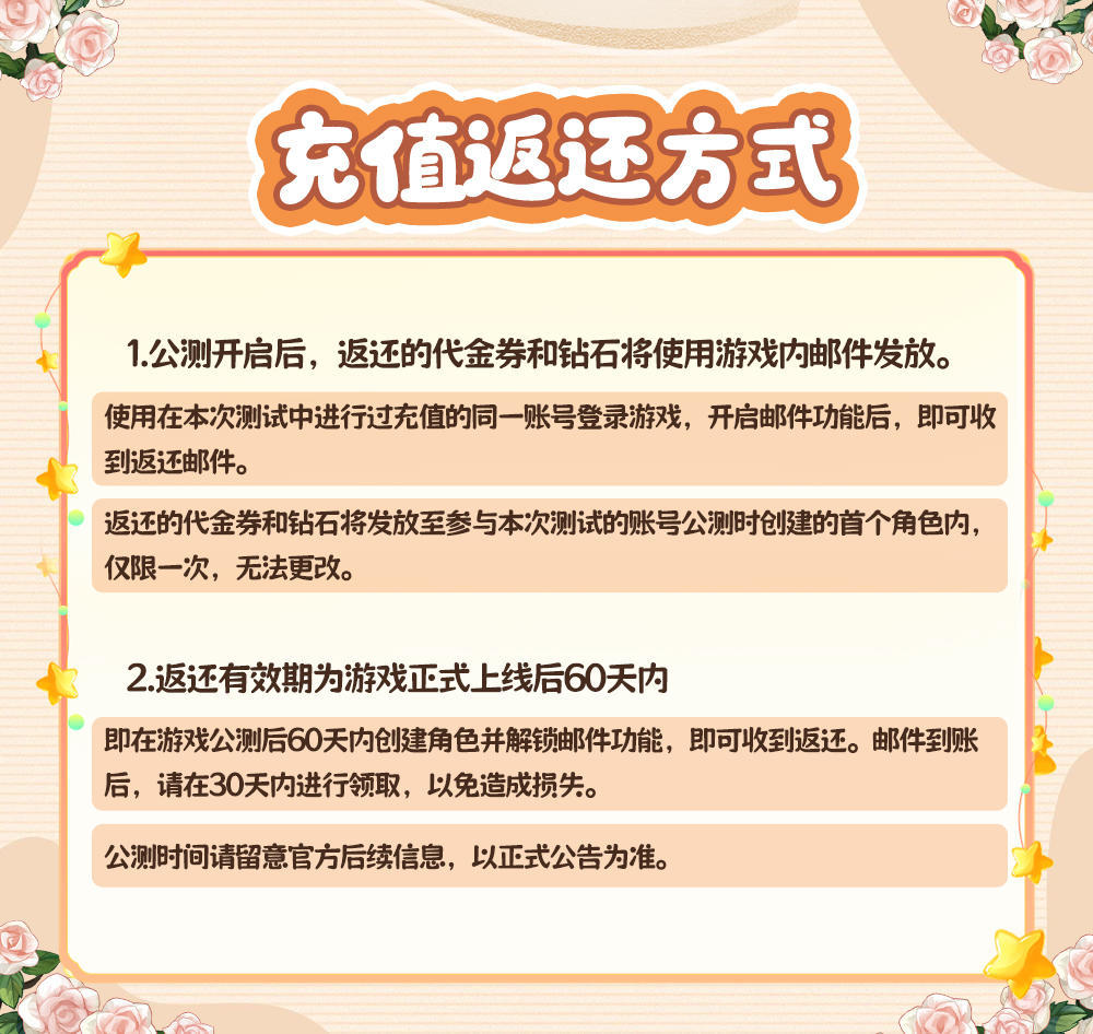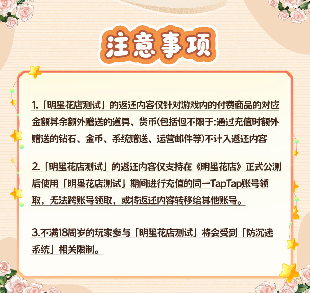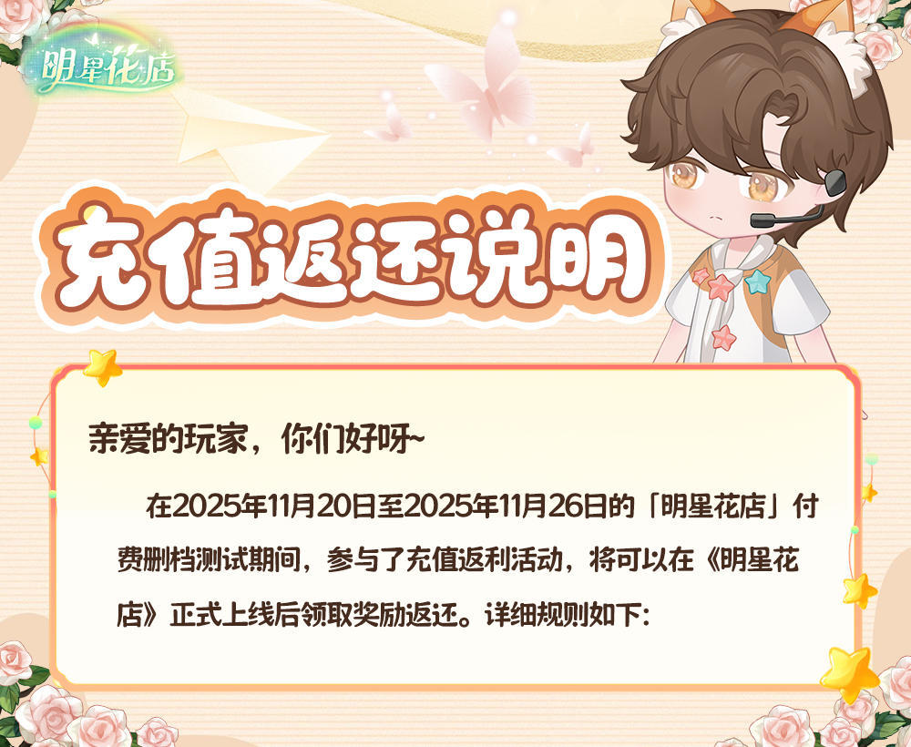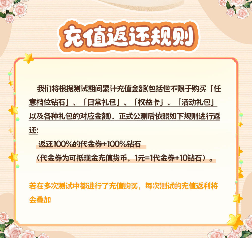 亲爱的玩家,你们好呀~在2025年11月20日至2025年11月26日的「明星花店」付费删档测试期间,参与了充值返利活动,将可以在《明星花店》正式上线后领取奖励返还。详细规则如下:充值返还规则我们将根据测试期间累计充值金额(包括但不限于购买「任意档位钻石」、「日常礼包」、「权益卡」、「活动礼包」以及各种礼包的对应金额),正式公测后依照如下规则进行返还:返还100%的代金券+100%钻石(代金