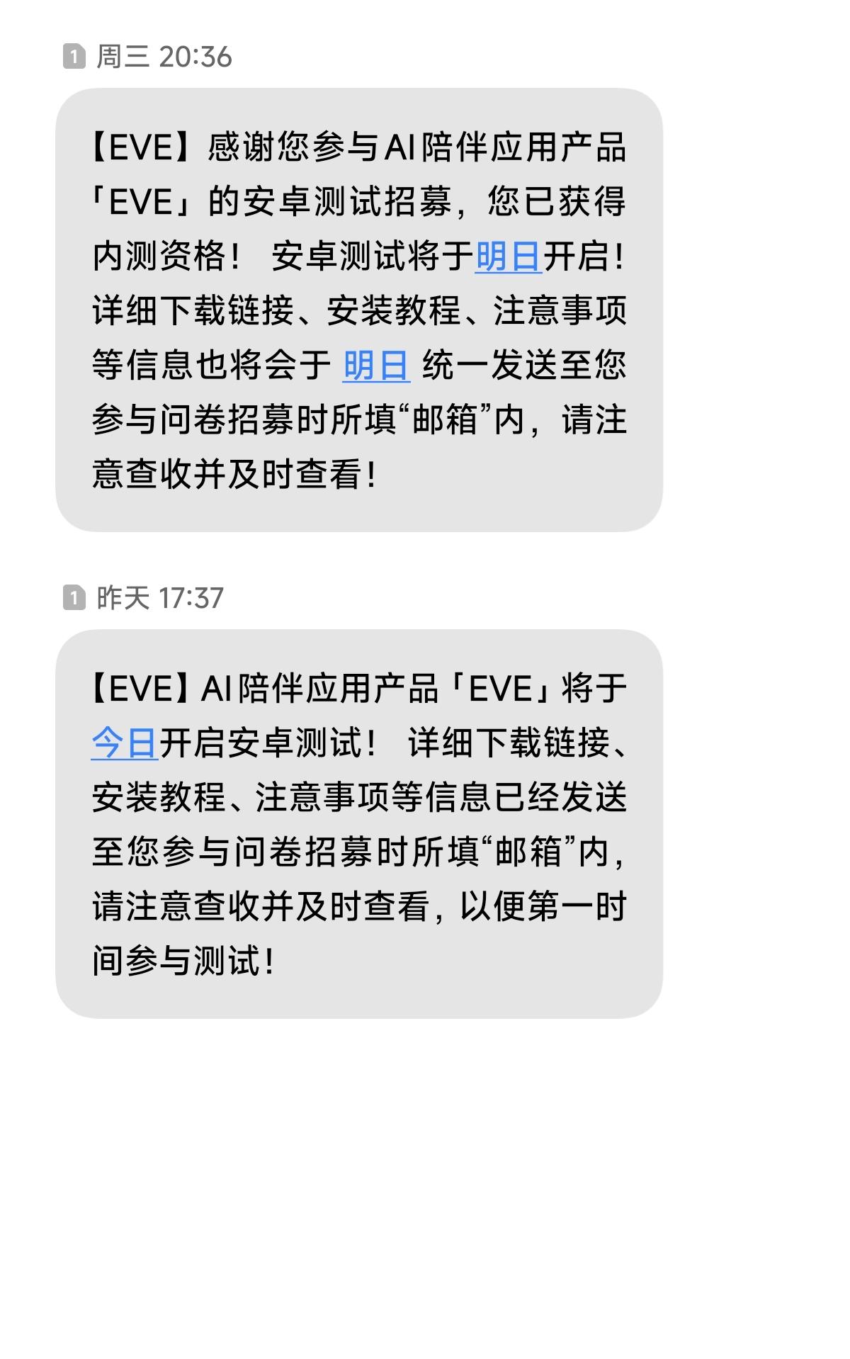 如题,下午五点多就收到第二条短信,到现在邮箱里还没有东西……xhs留言也没人回复,应该怎么联系官方客服要安装包……#eve二测 #eve