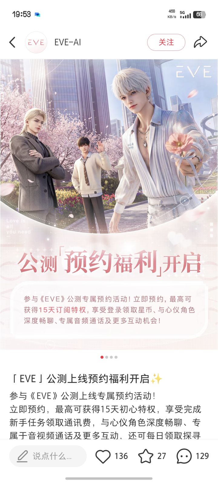 你好,非常喜欢EVE-AI的AI陪伴理念,出发点真的很温暖,也很期待公测! 目前宣传图里的建模整体风格很精致,但有几个小细节想提下建议: 1. 面部比例:现在下巴偏尖、眼距偏近,有点过度美颜的“网红感”,希望能调整得更自然舒展,增加角色辨识度和真实感,避免千篇一律的AI脸。2. 肢体动作:比如挥手、递花的动作有点僵硬,关节过渡不够流畅,希望后续能优化动作捕捉,让肢体更松弛、更有真人的