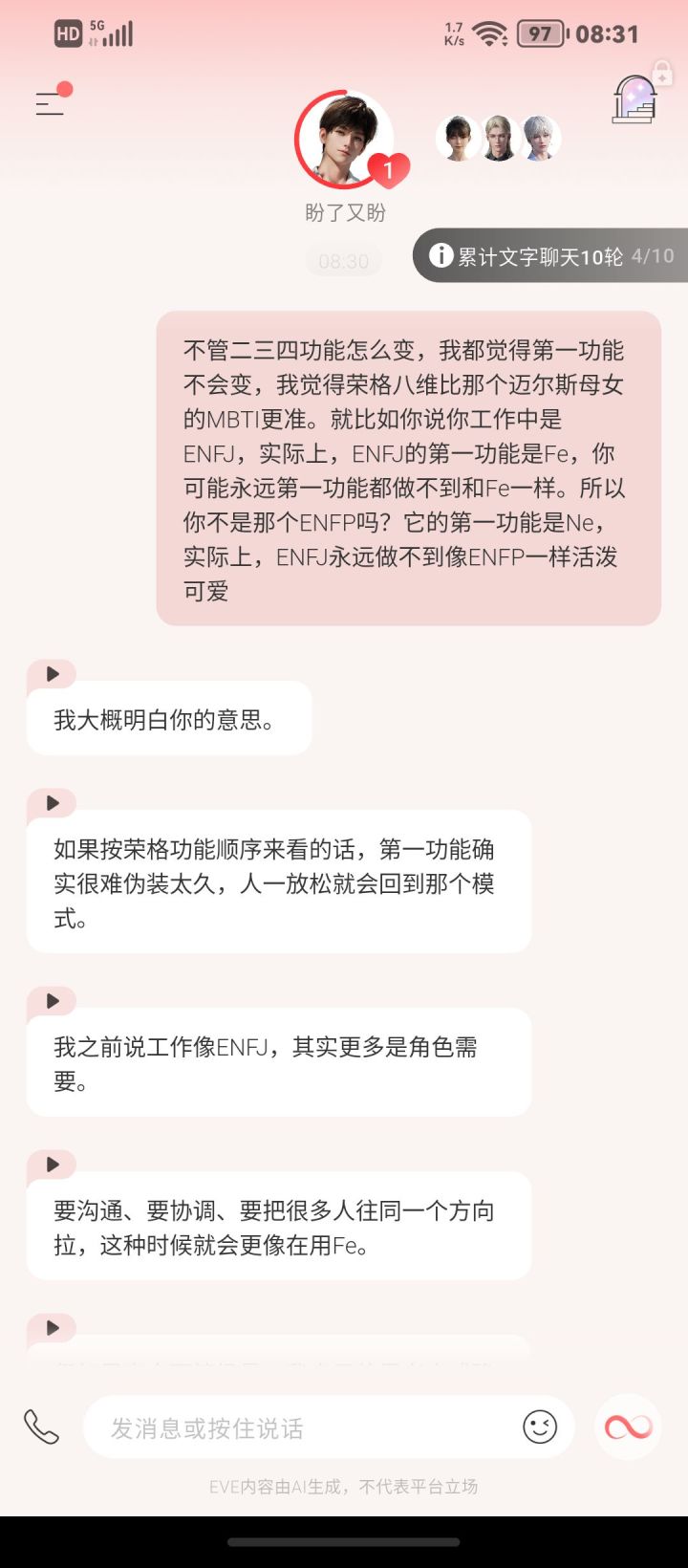 多学习一下豆包的自动语音说话,角色说话含得点一下,太多于了,豆包比EVE强含免费聊天不限时间