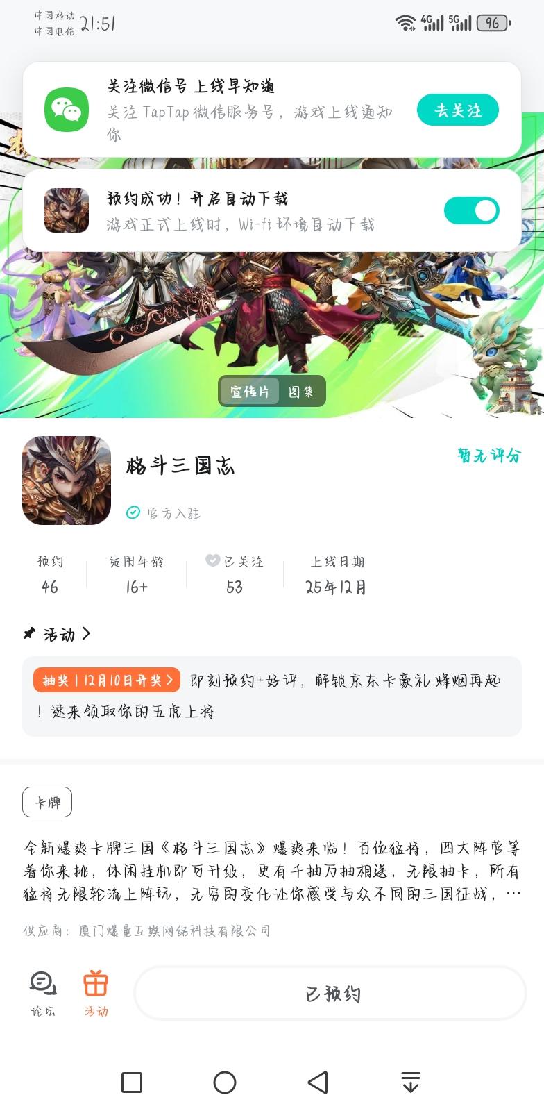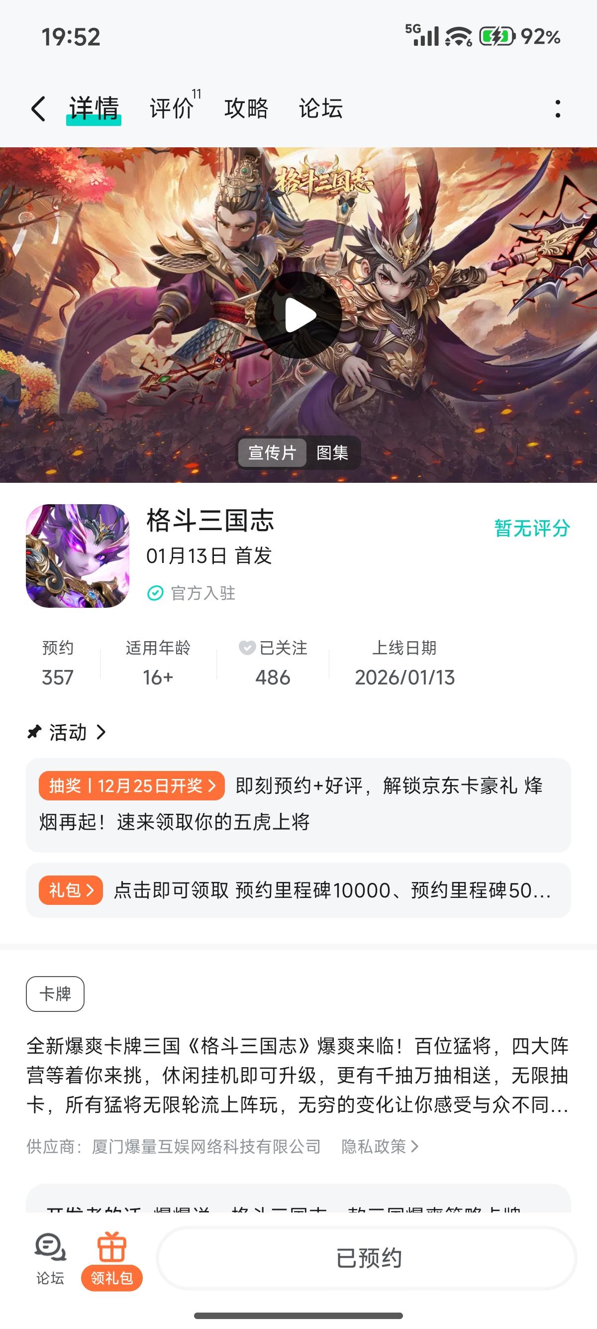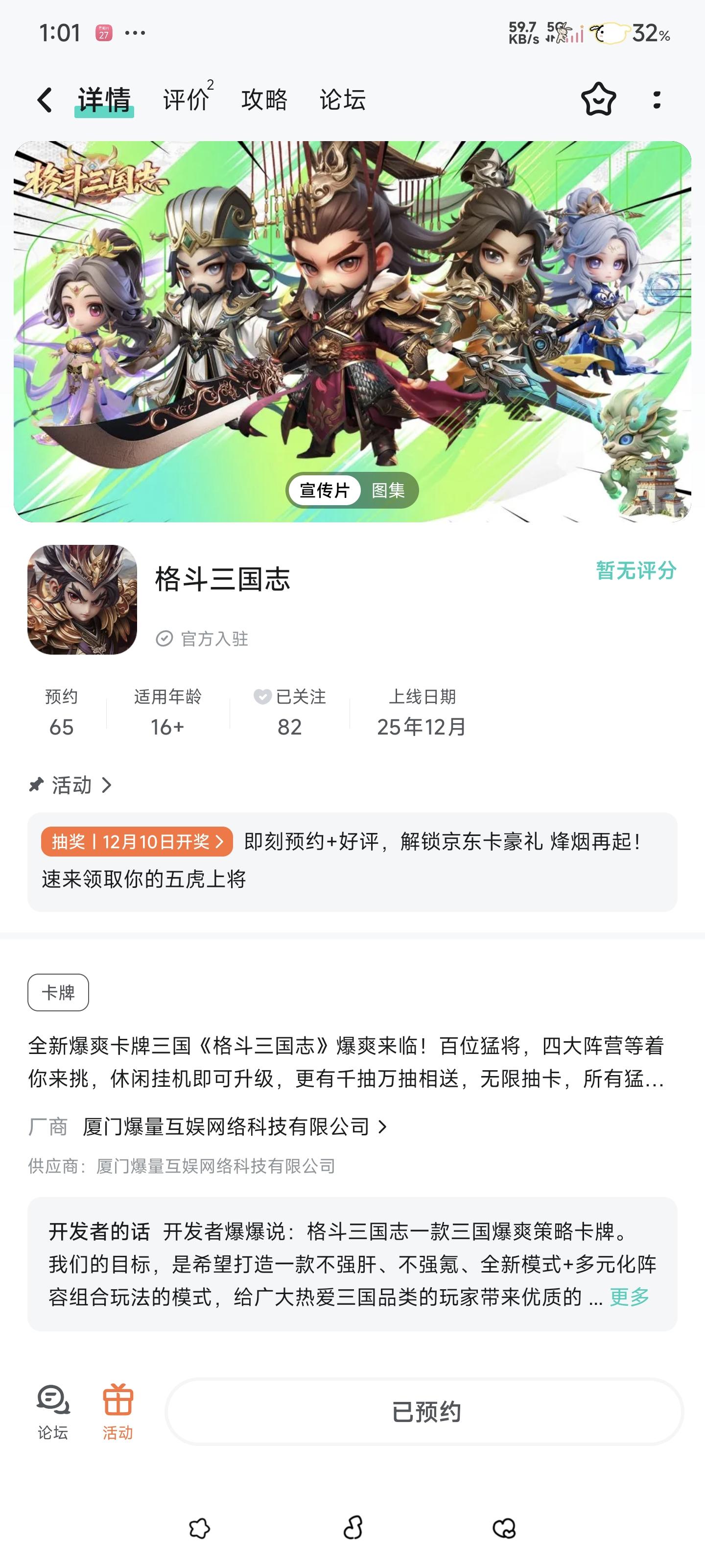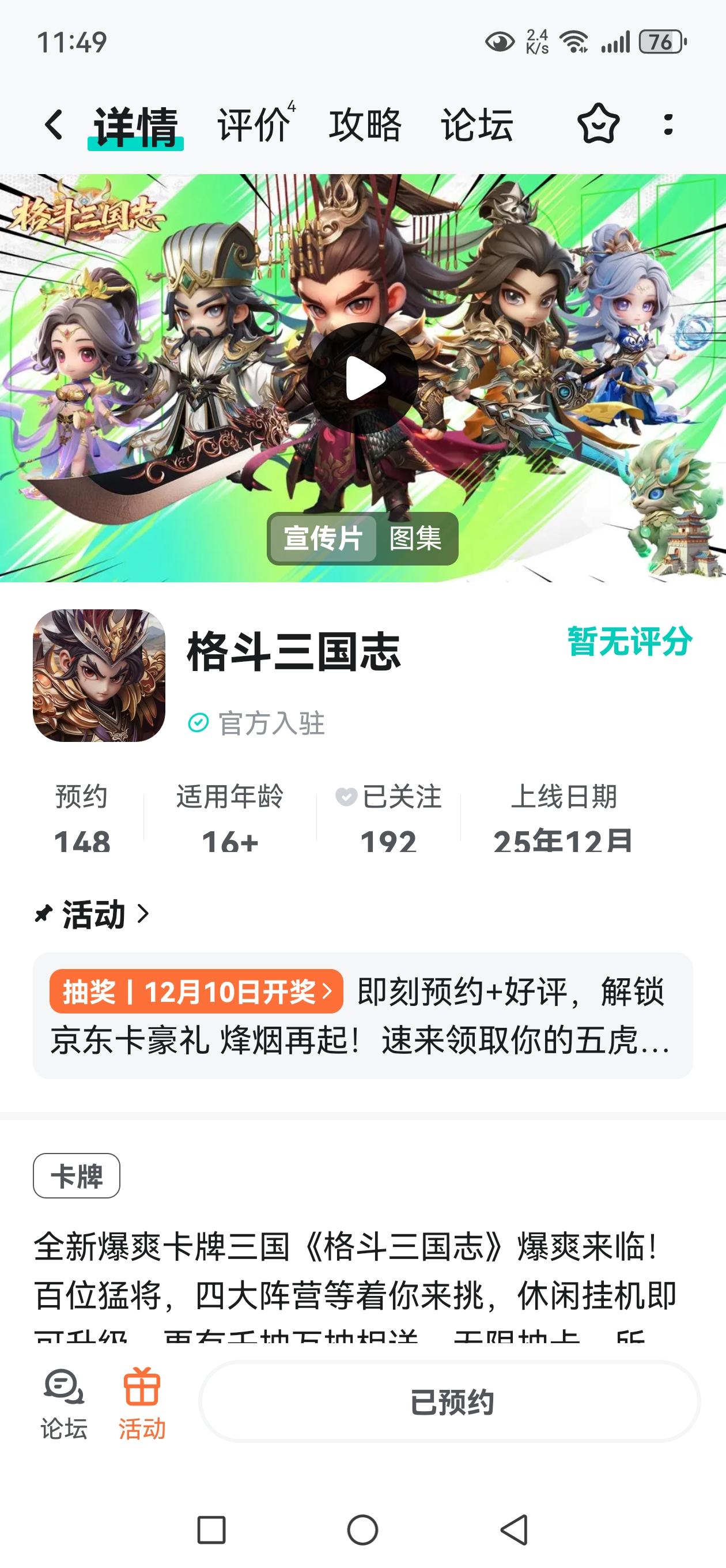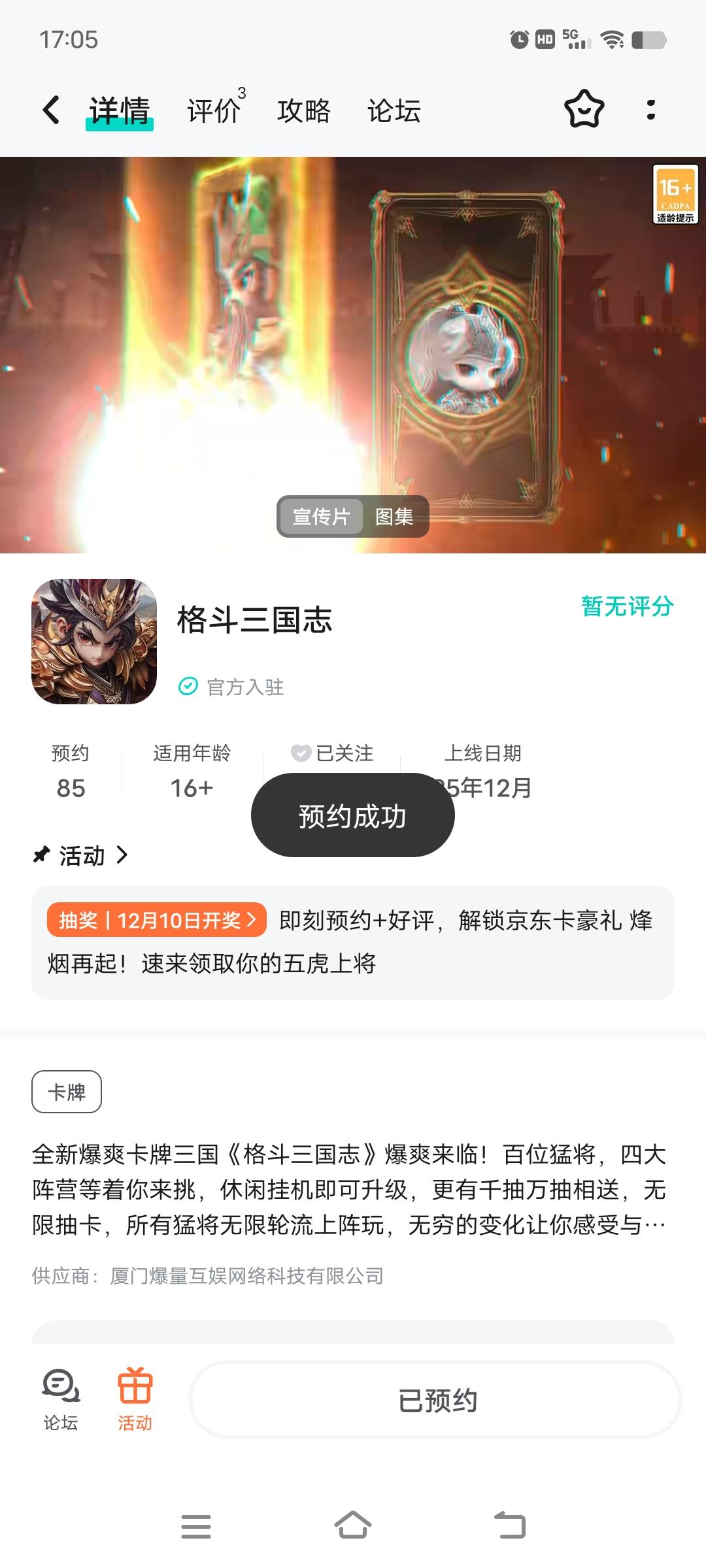 全新爆爽卡牌三国《格斗三国志》爆爽来临!百位猛将,四大阵营等着你来挑,休闲挂机即可升级,更有千抽万抽相送,无限抽卡,所有猛将无限轮流上阵玩,无穷的变化让你感受与众不同的三国征战,主公!快来带上你的五虎,阴谋阳谋,明说暗夺,一起拿下荆州!✨ 即刻预约,解锁京东卡豪礼▶ 参与方式1.点击关注发帖账号并预约《格斗三国志》且发新帖晒截图2.在本帖下方评论区分享发帖链接即可【奖品发放】到达开奖时