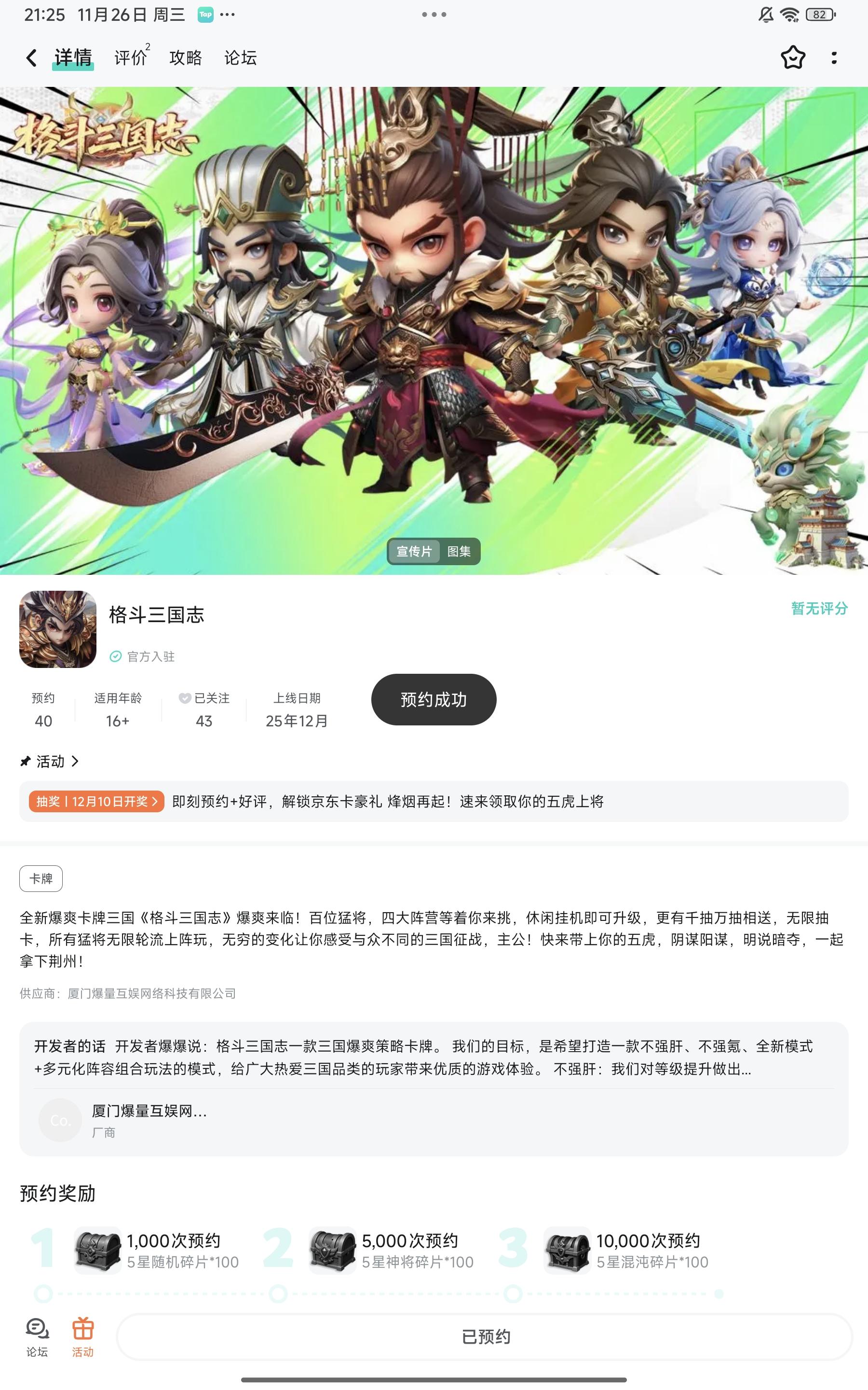 全新爆爽卡牌三国《格斗三国志》爆爽来临!百位猛将,四大阵营等着你来挑,休闲挂机即可升级,更有千抽万抽相送,无限抽卡,所有猛将无限轮流上阵玩,无穷的变化让你感受与众不同的三国征战,主公!快来带上你的五虎,阴谋阳谋,明说暗夺,一起拿下荆州!✨ 即刻预约,解锁京东卡豪礼▶ 参与方式1.点击关注发帖账号并预约《格斗三国志》且发新帖晒截图2.在本帖下方评论区分享发帖链接即可【奖品发放】到达开奖时