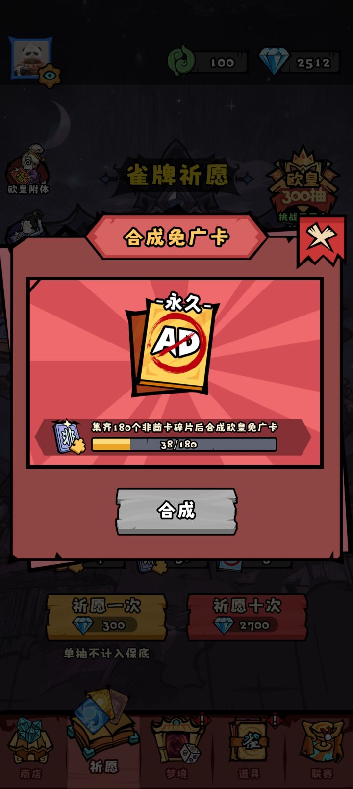 看了整整两个小时广告,其他什么都没干,总共抽了30多个碎片,好家伙要是想拿免广告卡,我这得不吃不喝啥也不干纯看一下午广告,我看你也别看麻将了,你直接改名摇一摇看广告