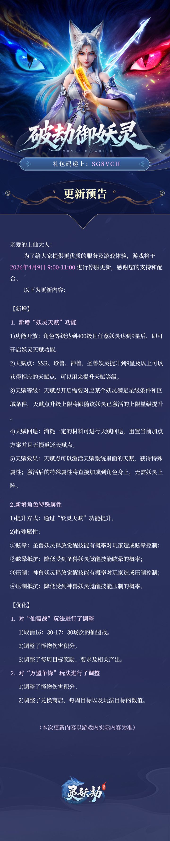 更新公告 | 《灵妖劫》4月9日版本更新