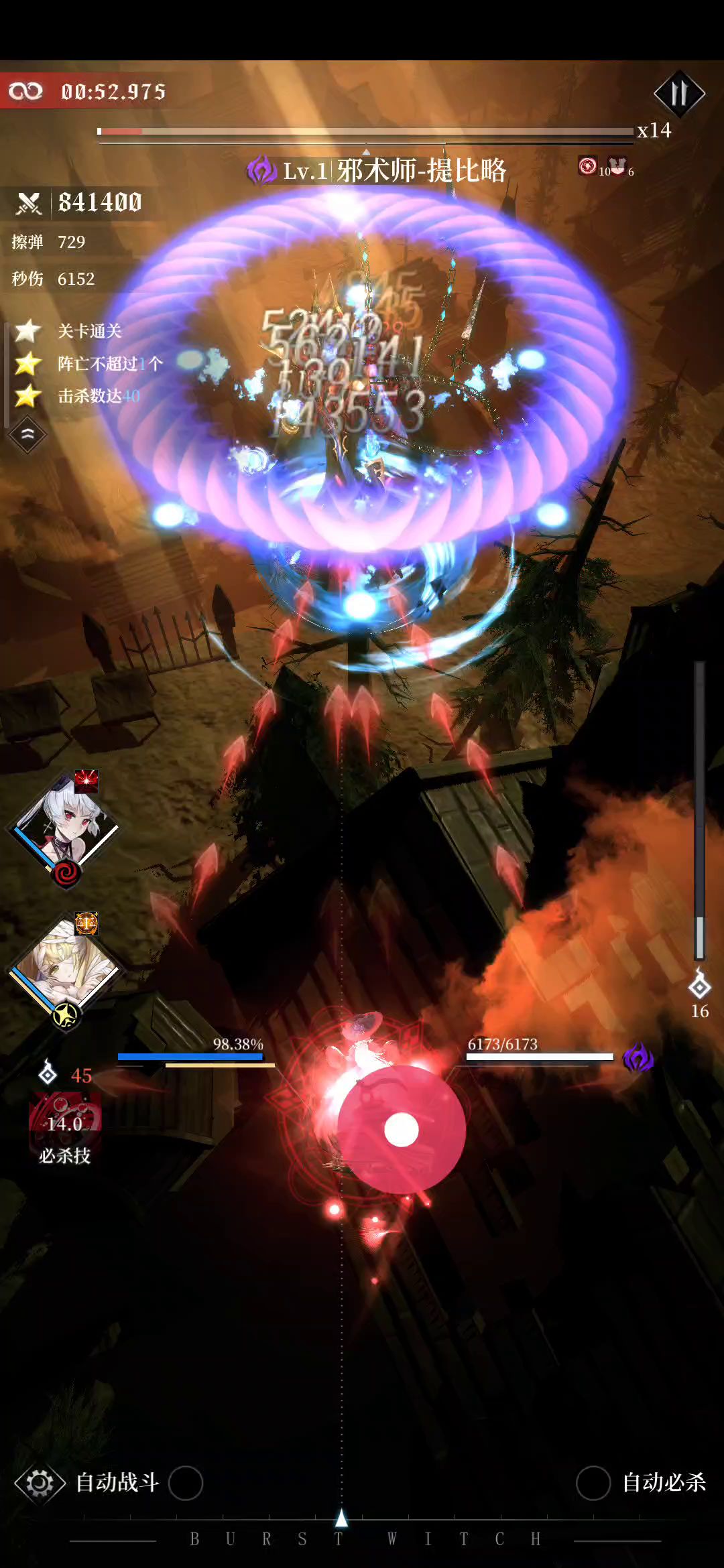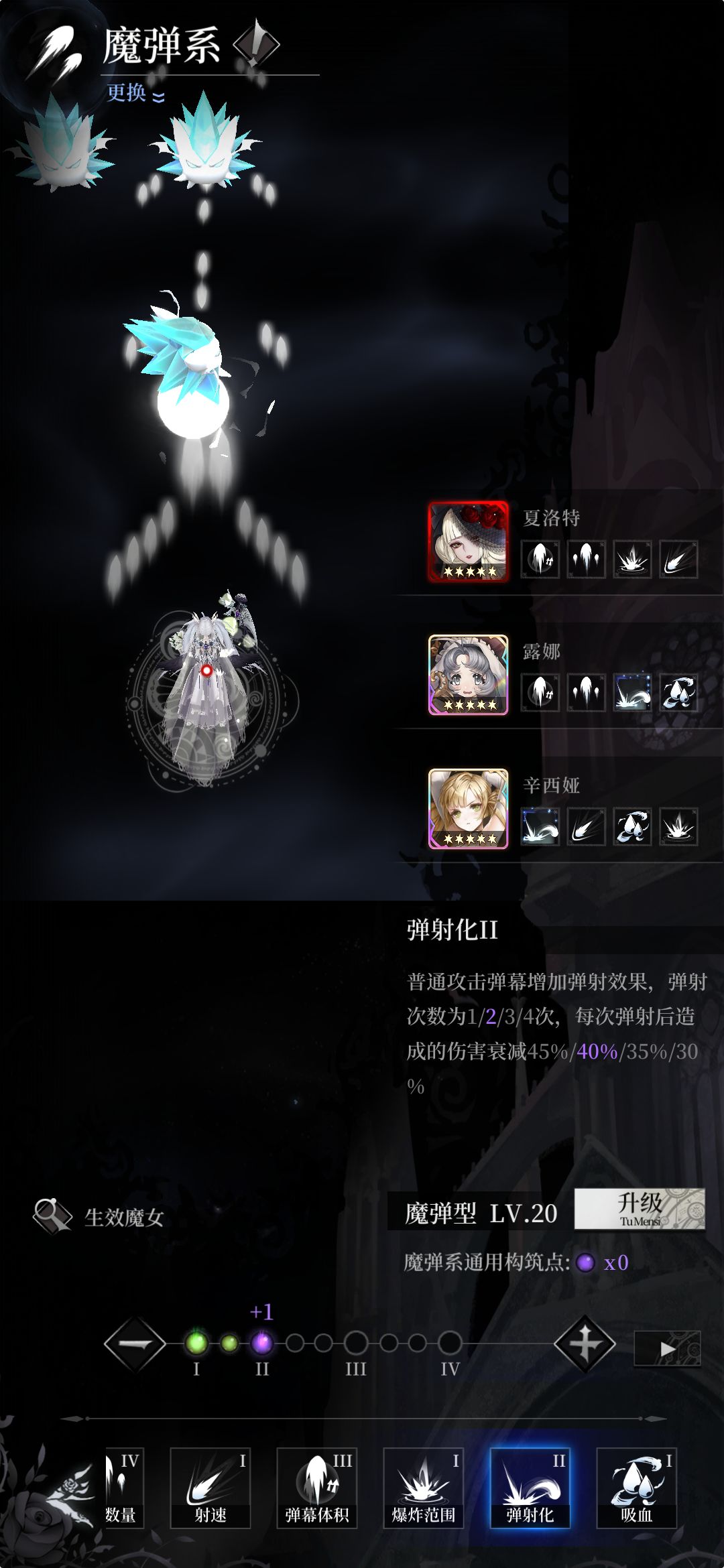 设置 剧情关建议手动释放,免得大招浪费于波次之间的空隙。 只有BOSS的挑战关建议自动大招,因为弹幕密度很高再去点大招很容易中弹。但如果大招带清弹幕功能,可选择手动释放清难点版位时的弹幕。 魔女 必须有一个SSR,因为SSR的初始攻击是SR的五倍,根据魔女池子50抽后开始加概率的设定,正常60-70抽出货,开服送的各种礼包和打关的奖励足够第一天白嫖70抽,这里建议第一个SSR去暗影池子抽,因为幽暗
