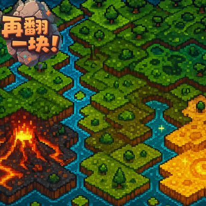 本游戏的核心玩法是翻地块,在一片随机地形的地图上,每天会自动翻出 2 个地块,选择一个翻开并探索完地块后,才能继续下一天,未选中地块会重新翻面并刷新新事件。地块探索遵循相邻规则,只有在已翻开的地块的相邻位置会随机翻出新地块,所有地块翻完后会解锁下一片地图。