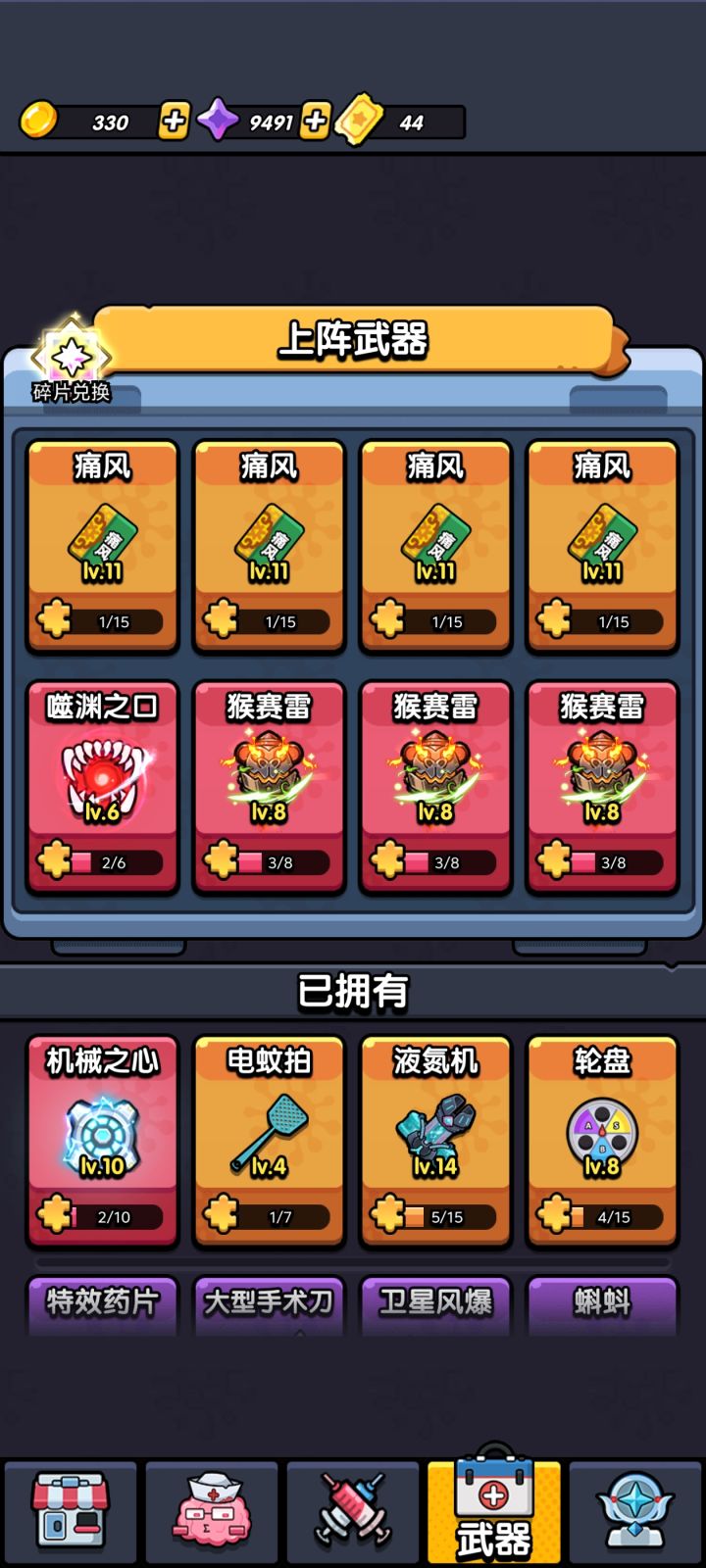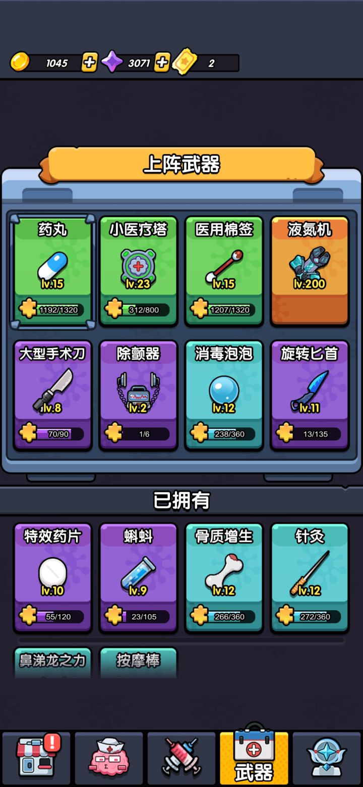 由于本人还正在摸索中,把目前摸索到的几个注意事项给大家公布出来1.副本方面:副本解锁后,起码要通关一次,这样就可以解锁扫荡功能,每天白嫖很多金币,钻石,武器碎片。通关无非是多看几次广告,轮盘那个副本进去看两次广告,合成128,然后单独把128放进左轮里,这样基本每次开枪都会选中这个128,其他副本没啥可讲的,死了看广告就行。2-1武器方面(角色在底端):前期可以用医疗塔,棉签,按摩棒,中期用大