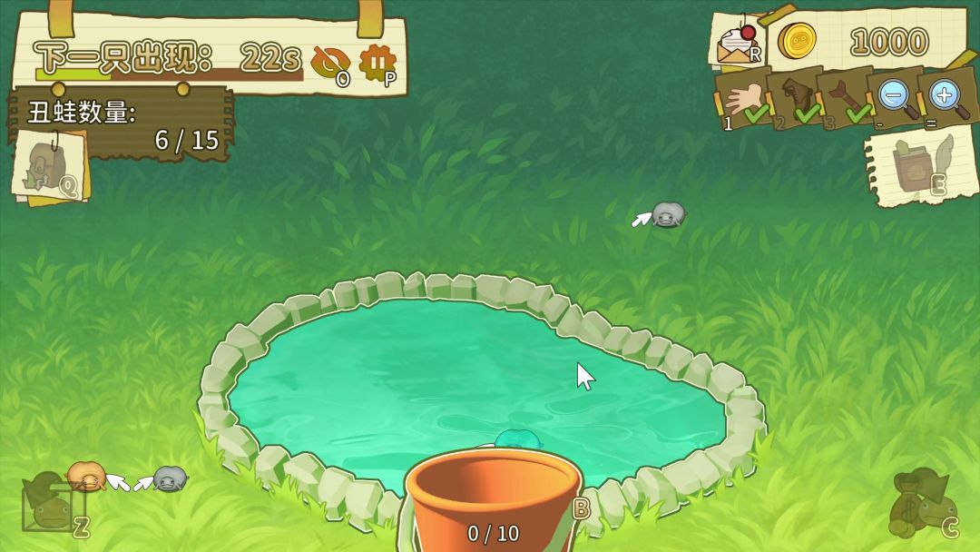 由FHNBHJ制作2P Games推出的休闲模拟经营游戏,玩家将作为土豆开拓镇成员在抗击蛙灾的最前线布置池塘环境,吸引各种丑蛙并将其抓捕养殖。游戏玩法上将挂机和模拟经营相结合,不过整体还是十分简单的,玩家只需要重复抓蛙、养蛙、卖蛙的流程即可,赚取到的钱用来购买装饰池塘以吸引到更高等级的丑蛙。游戏提供了144种造型奇特的魔性丑蛙给玩家收集,蛙蛙的美术风格还是比较新奇的那种,丑萌丑萌的也颇有一番风味。