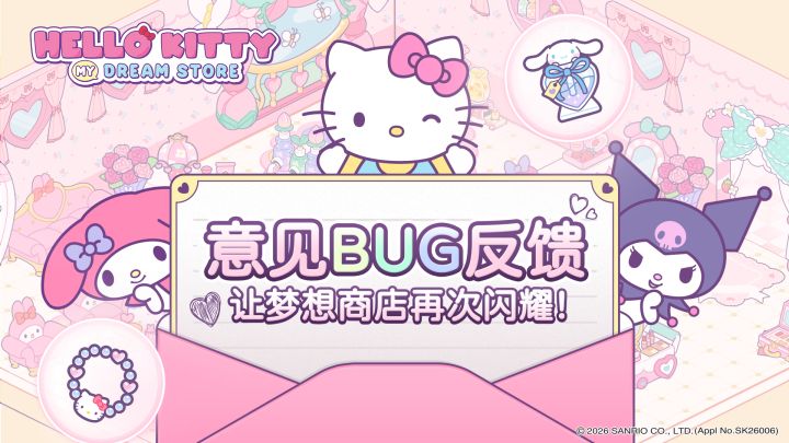 亲爱的萌主们~「梦想测试」正在进行中,感谢大家和三丽鸥家族的伙伴们一起打造梦幻购物城! 在造梦的过程里,如果遇到了小 BUG ,或是有超棒的创意建议,都欢迎告诉我们哦~你的每一条反馈,都是让购物城变得更完美的魔法!为了方便快速定位问题,需要在您反馈BUG时提供一些基础信息,回复格式参考: 【BUG反馈格式】 游戏昵称: 游戏内玩家ID: 手机型号: 网络情况:(WIFI/移动网络)#hellokittymydreamstore