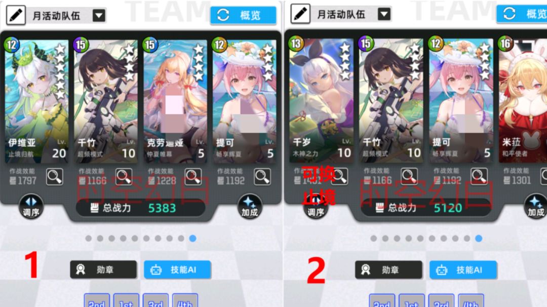 本次月活为毒属性,较好的上位替代品就是千竹、克劳、千岁等,选择多,因此卡稍微多一点的可以自行替换,本帖子意在为萌新配队,若有错误欢迎大家指正!废话不多说,配队如下 该活动能重复刷新队伍且不限次数,因此可以挑简单的打,以下为推荐可以打的队伍,一下排名分顺序,难度依次递增 1. 蚀日丽影 2.千客万来 3.冰煌之翼 4.千夜雷鸣 注:该队伍实测过,15/20票的这几个肯定能打过,最后一集略微吃力,请勿