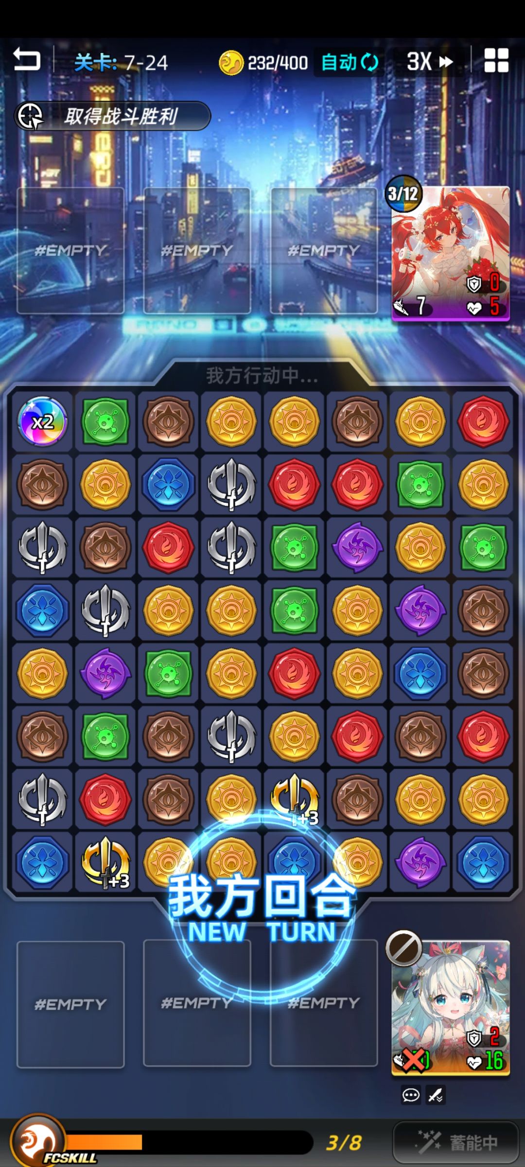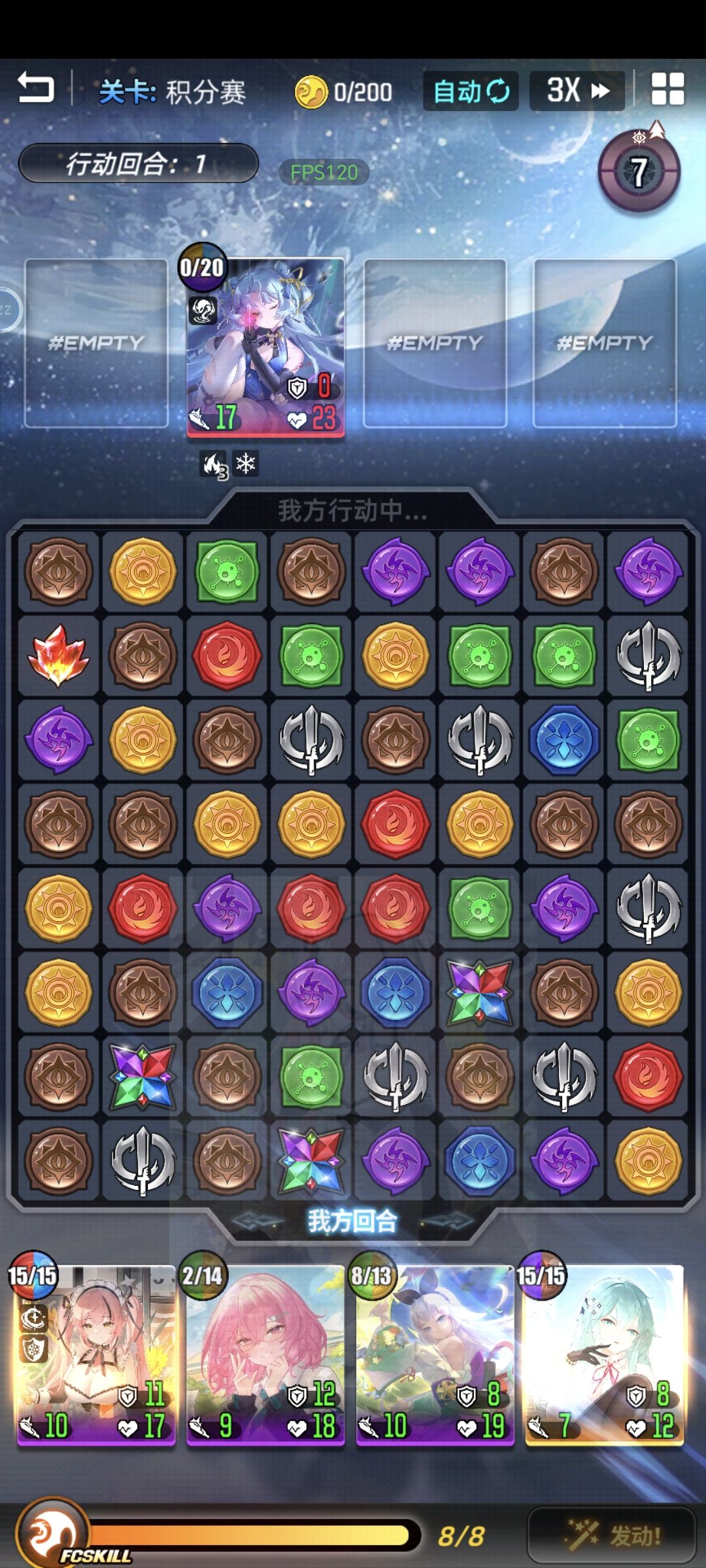 以上是本系列的总篇 以下百分比为获得额外回合的几率 托雷(爆破29颗) 无潮汐 31/105=29.5% 托雷(爆破摧毁全屏) 无潮汐 34/100=34% 厄潮汐 68/100=68%(同火雷冰光毒) 与托雷同一模板的角色适用同样的额外回合概率,对于这类角色来说,潮汐是什么颜色的属性宝石无关紧要,关键在于是否有潮汐。潮汐对宝石出现几率的增幅越多,释放技能后获得额外回合的几率越大 棋盘规