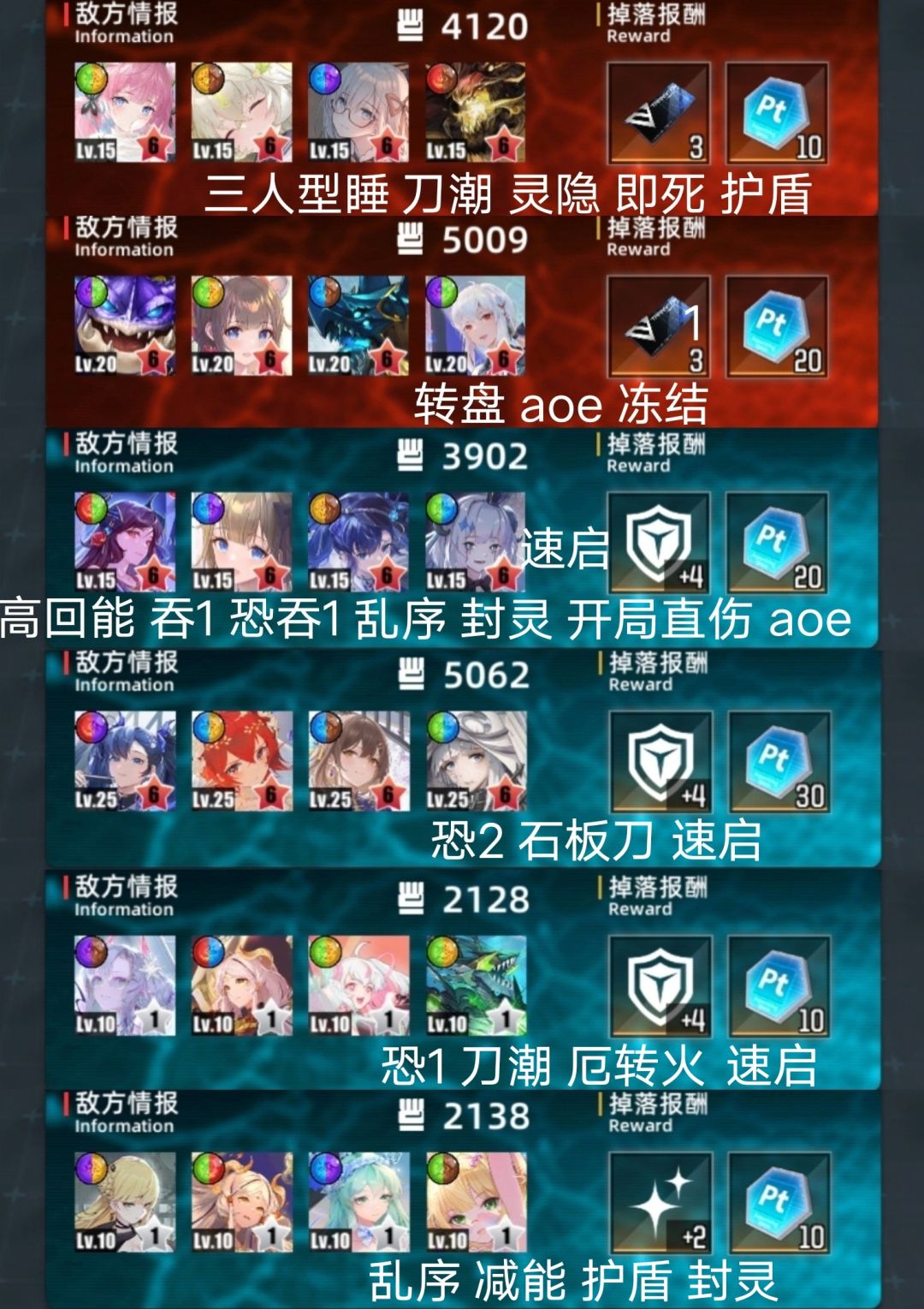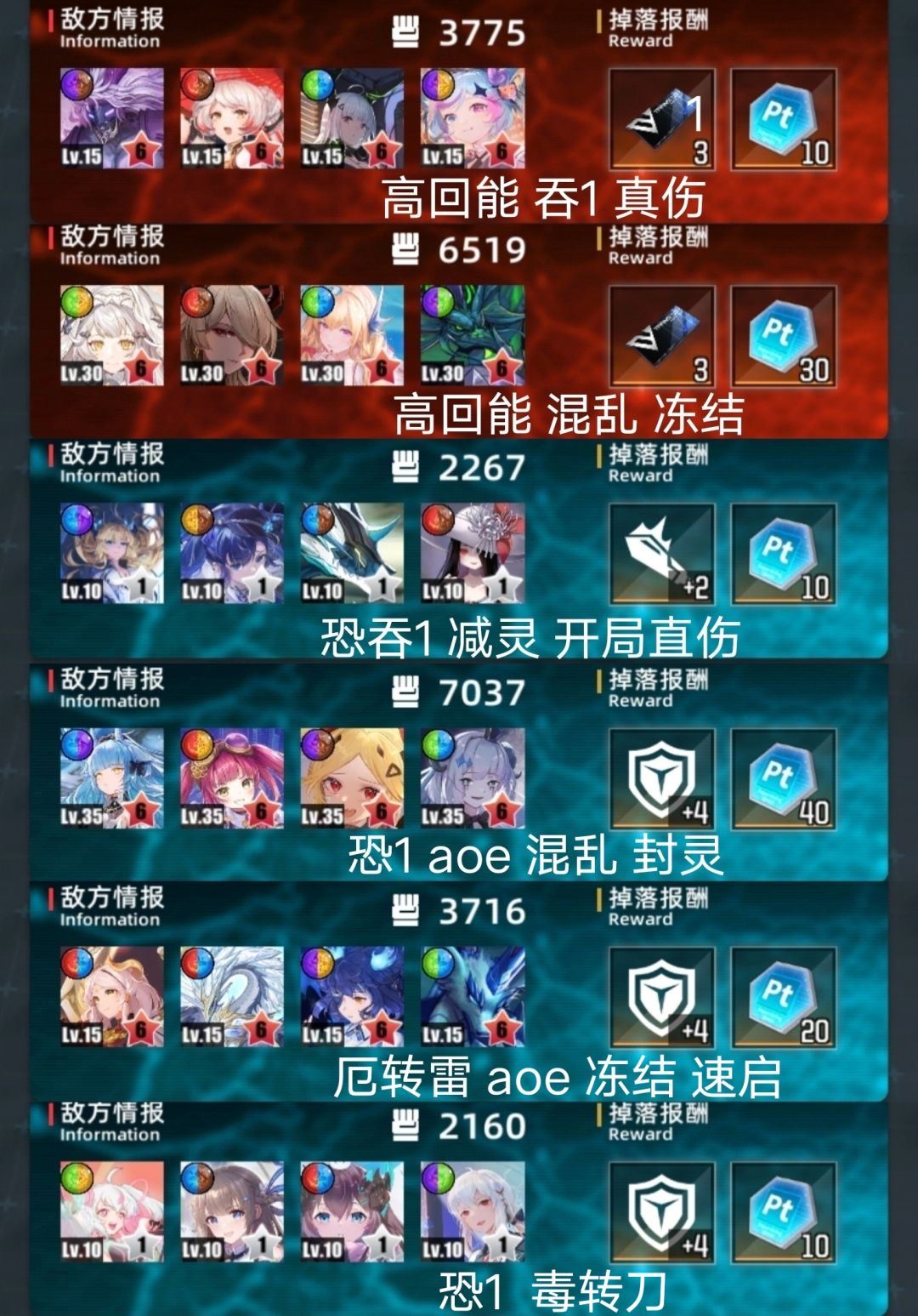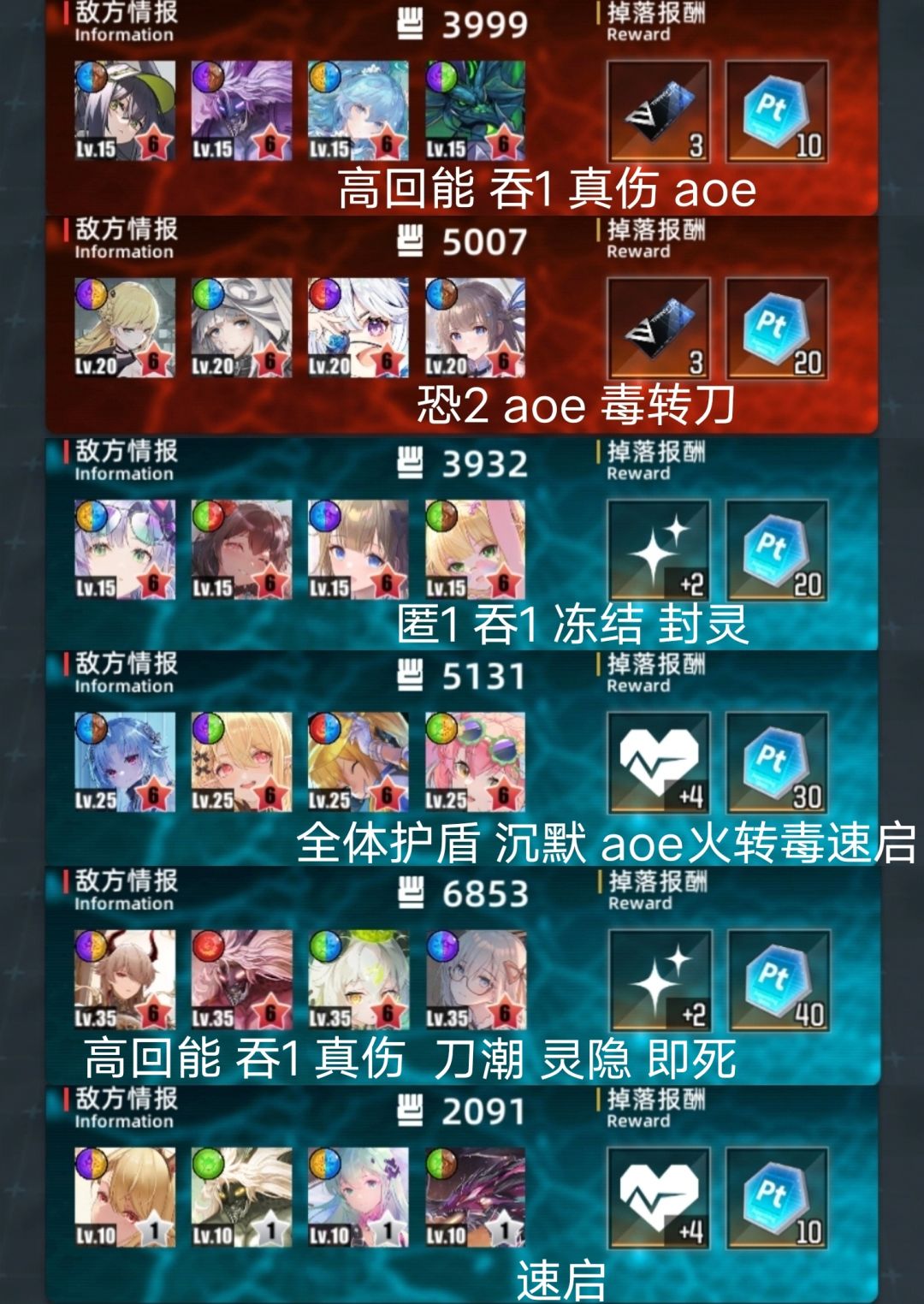 整体略难。门神较易,道中较难。 免吞略多3个。免恐常规13个。 机制很多,什么玩意都有,且多高回能速启。 真伤少,可用盾队。 aoe少,开门杀多,二礼包难高层。 三图。高层。 一队芙叠血4231。二位可其他回能。 二队格温吞3241。四位可限制或其他回能。 二队金格吞4231。手动开一位盾,或换子夜等 三队菲奥队3214。二位可其他回能,四位可换 四图。偏低层。 一队刷钱3124。四位可换其他回能