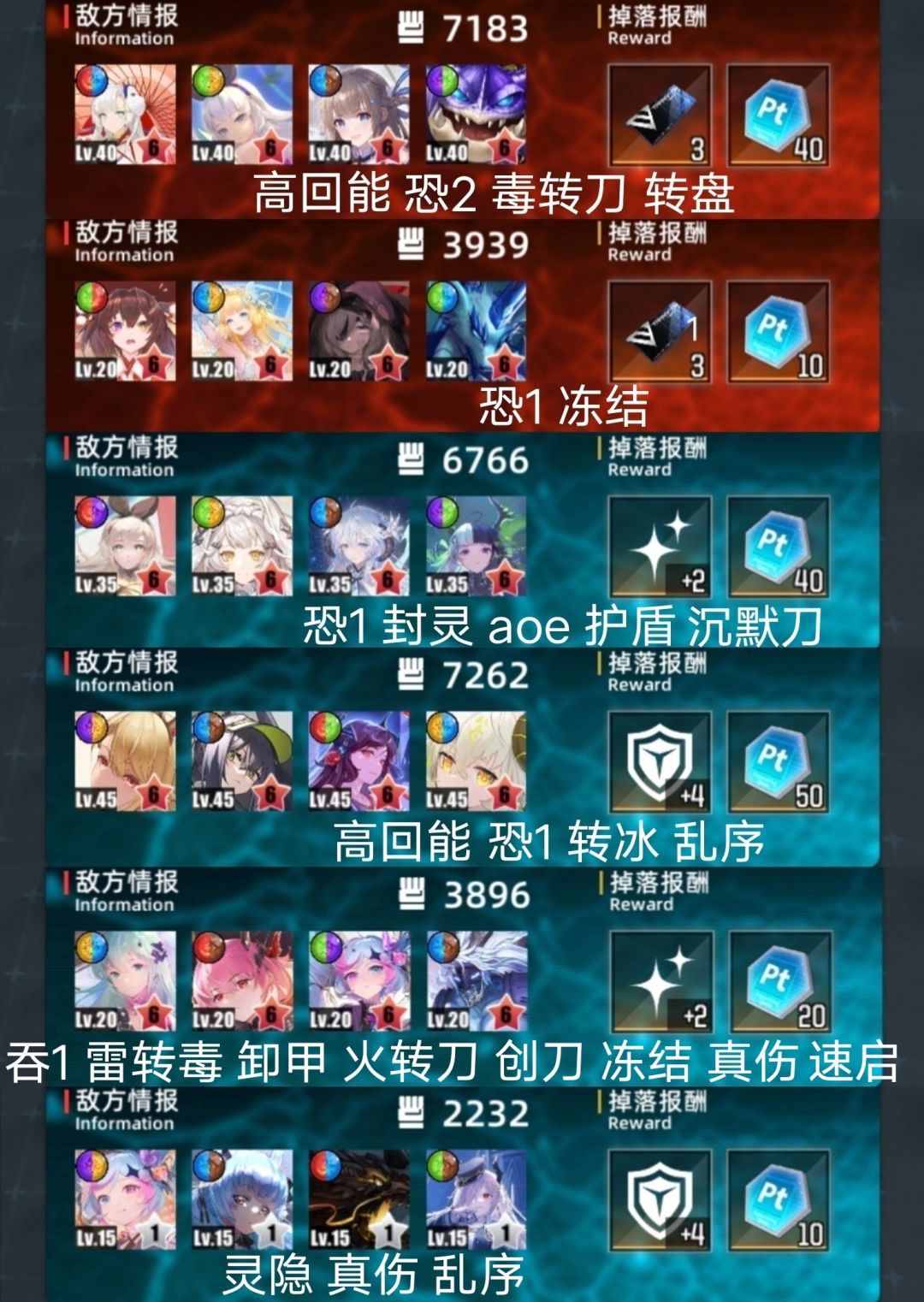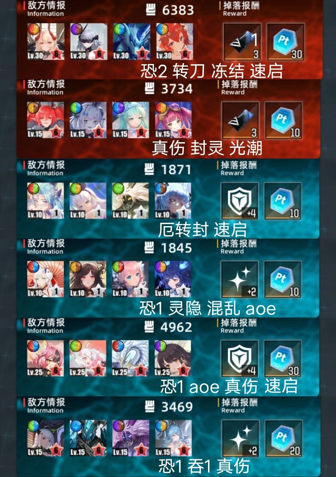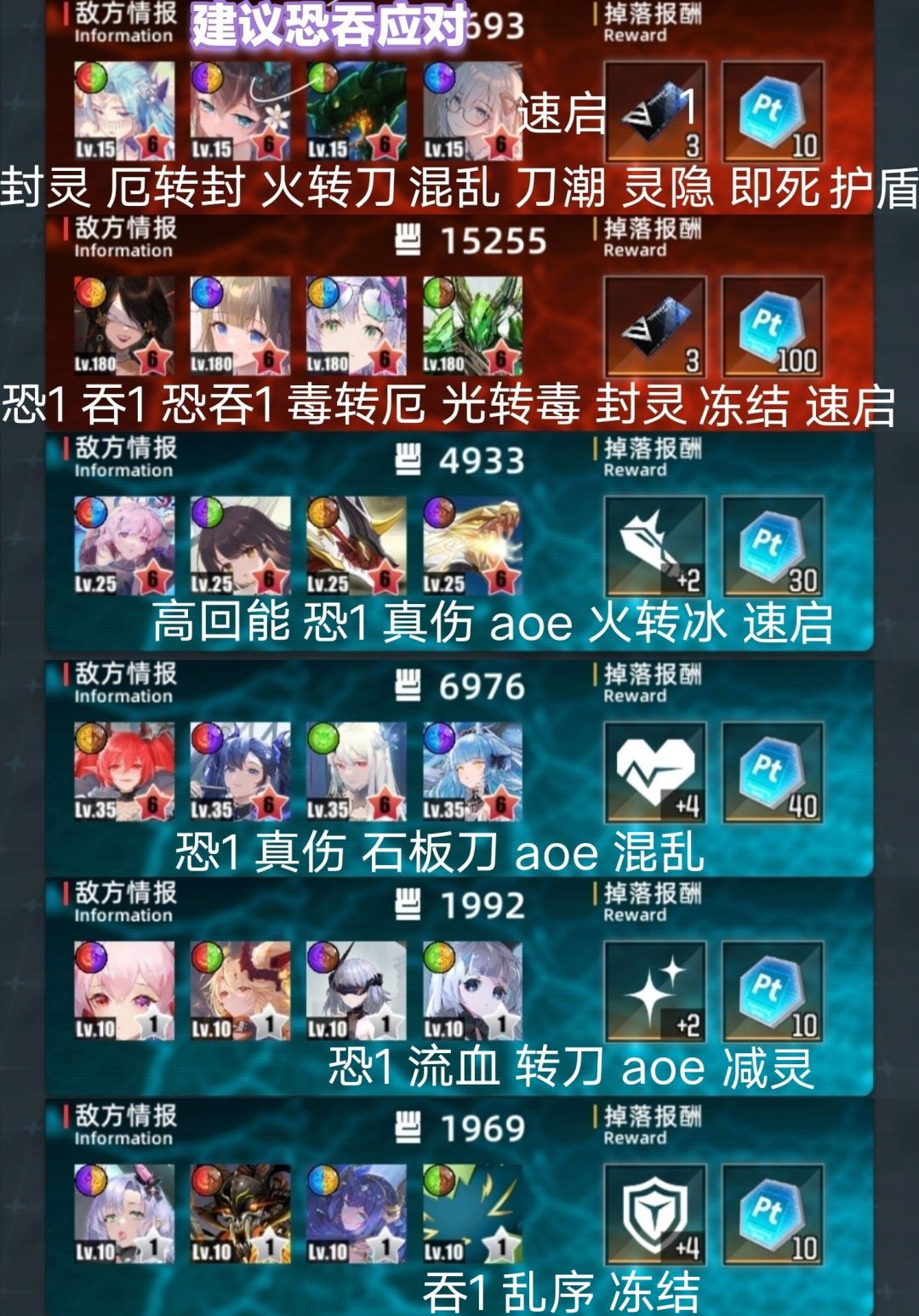 整体略难。门神较易,道中较难。 免吞略多3个。免恐常规13个。 机制很多,什么玩意都有,且多高回能速启。 真伤少,可用盾队。 aoe少,开门杀多,二礼包难高层。 三图。高层。 一队芙叠血4231。二位可其他回能。 二队格温吞3241。四位可限制或其他回能。 二队金格吞4231。手动开一位盾,或换子夜等 三队菲奥队3214。二位可其他回能,四位可换 四图。偏低层。 一队刷钱3124。四位可换其他回能
