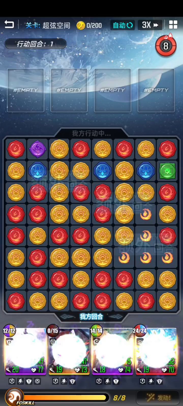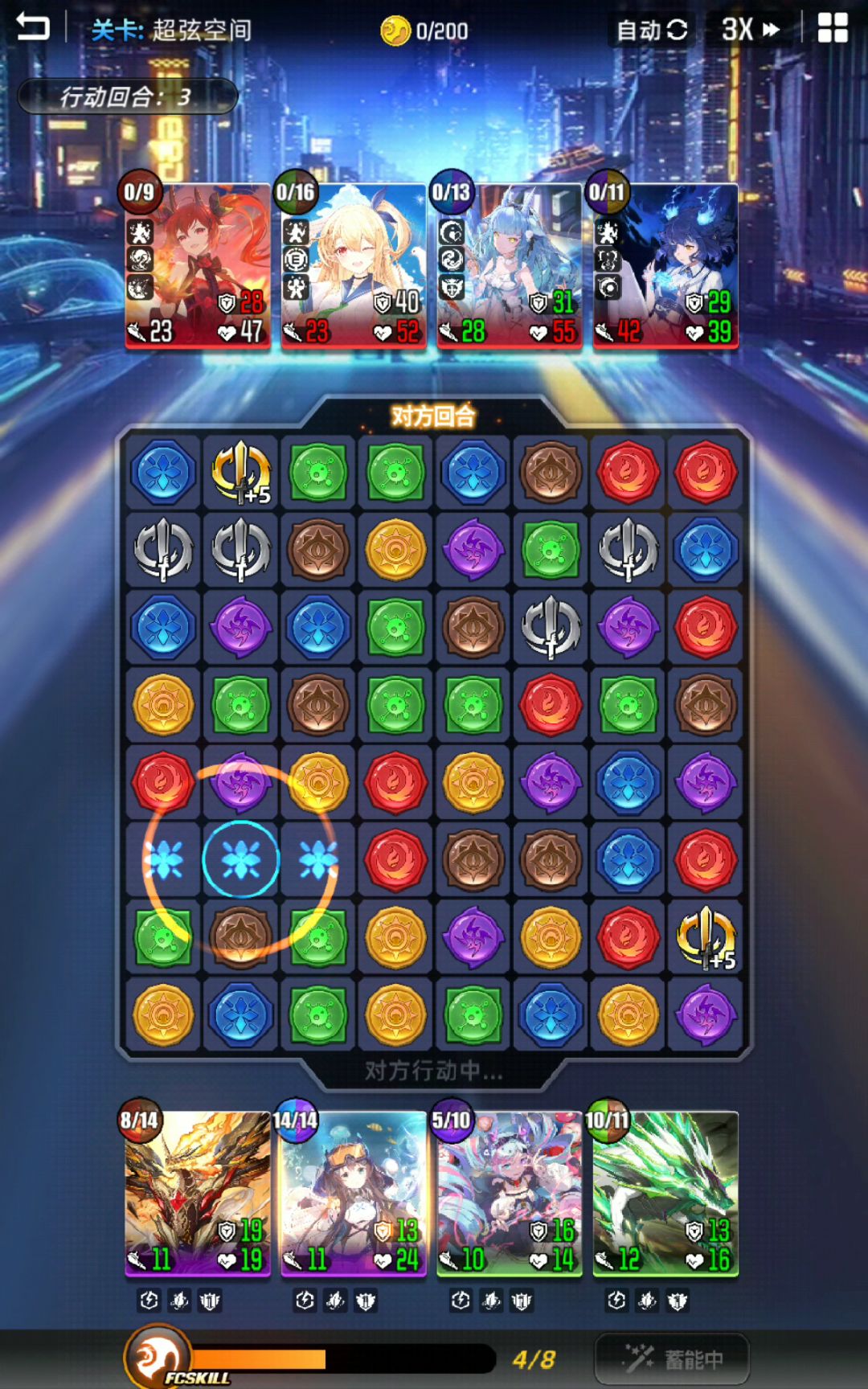 自动顺序:2134,优先技能。 核心是六星BOSS俄刻诺斯的三天赋,四消有概率使敌方四号位“意外身亡”:无视属性,无视天赋,现版本没有任何一张卡能挡住的即死判定。 再加上火光队的无限铁三角:小神+雪儿+梓。小神一次技能能有3~5次四消,能高频率的对敌方进行即死判定。从而迅速击杀敌人。 理论上只需要梓和俄刻诺斯开3天赋即可。也可以开小神1天赋加强生存。 视频为超弦第51层,没往上打是因为免费门票用完