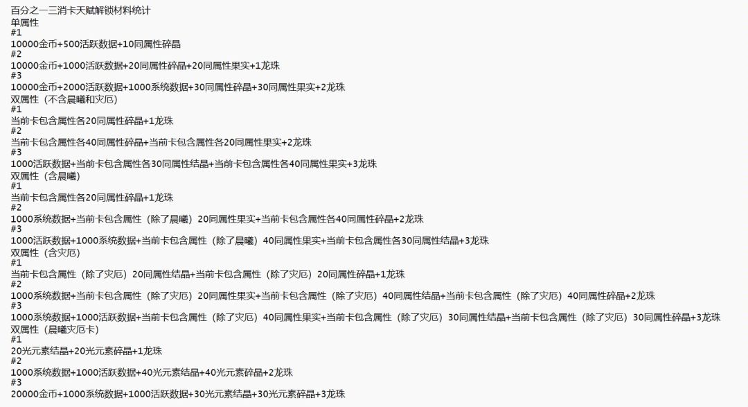 三消卡天赋解锁材料统计