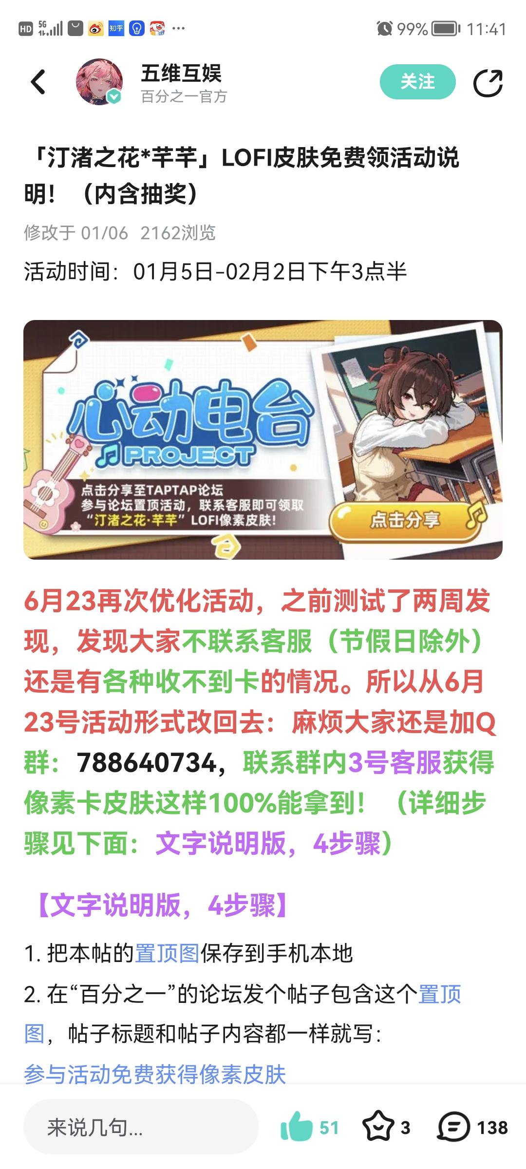 活动时间:01月5日-02月2日下午3点半 [图片]6月23再次优化活动,之前测试了两周发现,发现大家不联系客服(节假日除外)还是有各种收不到卡的情况。所以从6月23号活动形式改回去:麻烦大家还是加Q群:788640734,联系群内3号客服获得像素卡皮肤这样100%能拿到!(详细步骤见下面:文字说明版,4步骤) 【文字说明版,4步骤】 1. 把本帖的置顶图保存到手机本地 2. 在“百分之