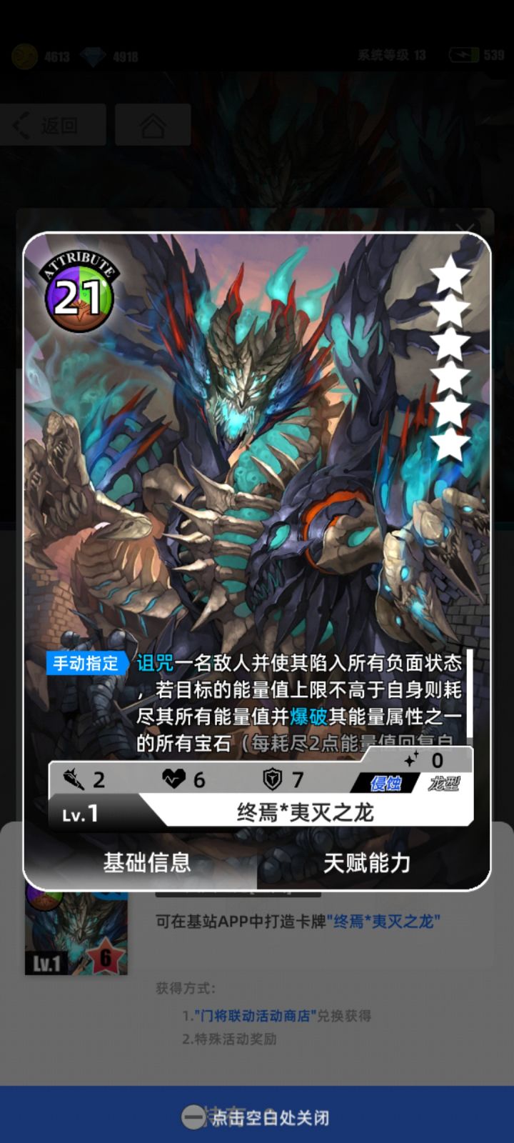 游戏名称:百分之一 游戏平台:TapTap 游戏时长:七天 适合人群:零氪党 休闲党 游戏体验: 原本是奔着美少女来的,发现有龙,有机甲,眼睛一下就直了。这游戏很好玩,不同卡牌的效果,组合在一起,会形成各种combo,无限连招(在积分赛被拷打了)。很有趣,能够无限连别人,让对方动都动不了,这也是不得不品鉴的一环 许愿六星卡牌:终焉·夷灭之龙 (纯新手,不知道什么强, 看到
