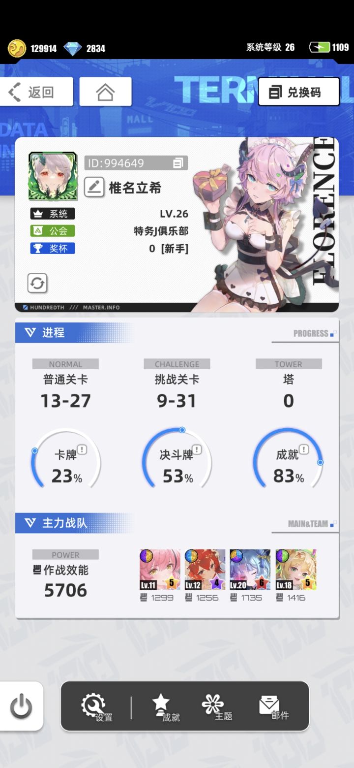 游戏名称:百分之一 发售平台:TapTap 游戏时间:晚上休闲时间 推荐人群:学生党 游戏体验:之前玩过开心消消乐,这款游戏加入了二次元元素,相对来说更喜欢一点。同时立绘也十分好看 许愿六星卡牌:代号s尼雅游戏名称:椎名立希 账号ID:994649