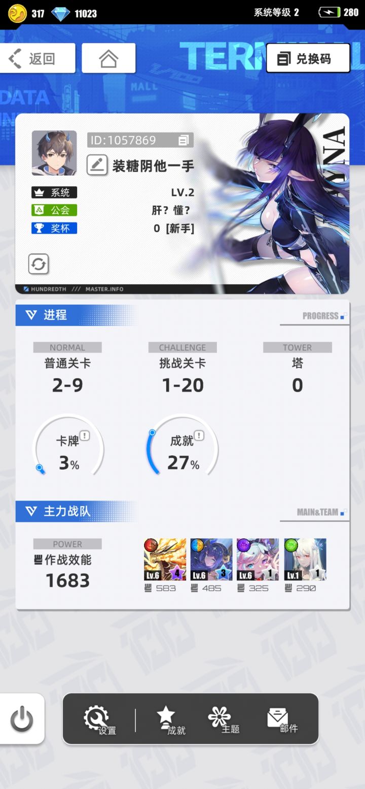 游戏名称:百分之一 游戏平台:TapTap 游戏时长:萌新玩家 适合人群:零氪党 休闲党 游戏体验: 游戏是很轻松的,是以消消乐的形式来展开,且运用了回合制的战斗方式,并且资源是很丰厚的,玩起来能体会到小时候玩游戏的感觉,过年闲着没事玩一玩就很安逸~ 最吸引人的就是手机桌面的设计,甚至能电话 许愿六星卡牌:代号p 冷落雪 安卓官服TapTap 游戏名称:钛窟菈帐号ID: 465