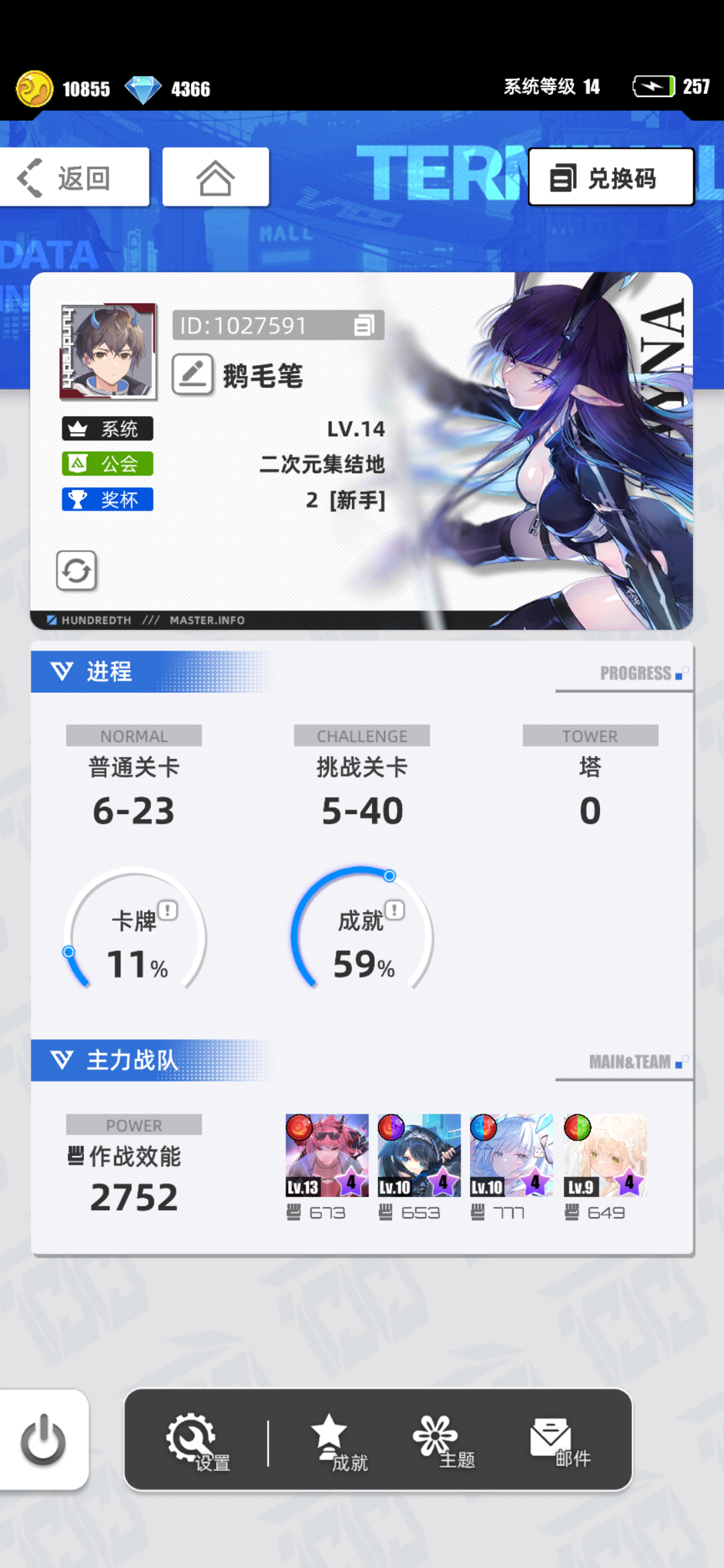 游戏名称:百分之一 游戏平台:TapTap 游戏时长:玩了半个月适合人群:上班族和卡牌玩家 游戏体验:我很喜欢这类竖屏可以上班摸鱼玩的游戏,百分之一也完全不肝,能在上班时间挂机打打日常,很舒服,希望游戏能越做越好许愿六星卡牌:代号P·冷落雪 游戏名称:东承灵 帐号ID:1018786