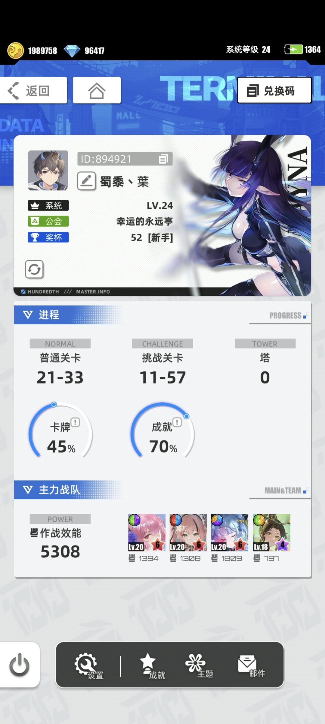 游戏名称:百分之一 游戏当时发售平台:TapTap 玩游戏的时间:入坑半年 推荐人群:闲鱼玩家、二次元、集卡党 正文:这是一款二次元休闲游戏,非常适合上班摸鱼游玩,人物的立绘也好看,非常符合我的胃口,不肝不氪,福利也很多,最后希望游戏越做越好 许愿游戏六星卡牌:妖兽*鵺 游戏名称: 木剑游侠儿 帐号ID:811525 TapTap 安卓区