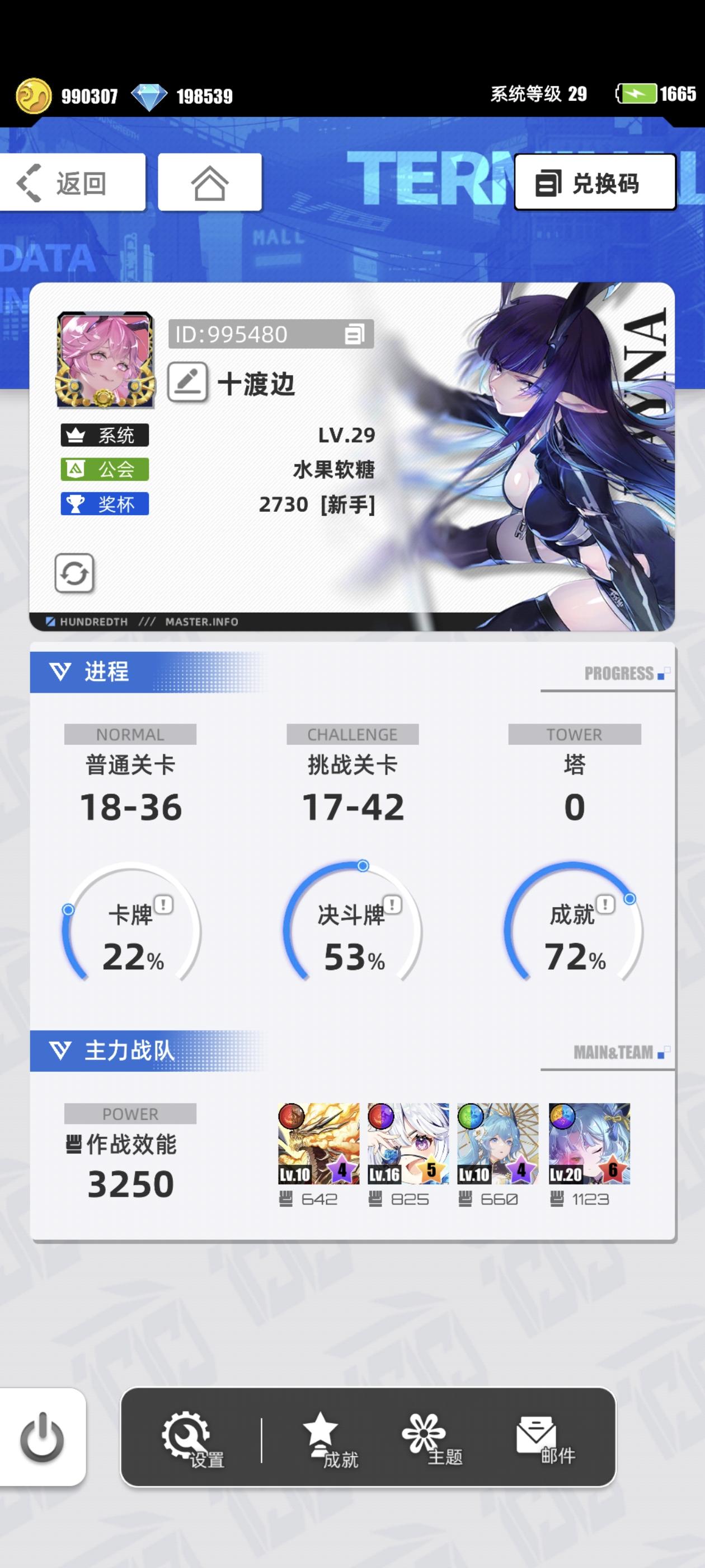 游戏名称:杖剑传说 游戏平台:TapTap 游戏时长:萌新玩家 适合人群:放置类 养成游戏爱好者 游戏体验:难度不高,操作简便的低肝度游戏 许愿六星卡牌:代号P·冷落雪 游戏名称:坐牢糕手 帐号ID:1039764