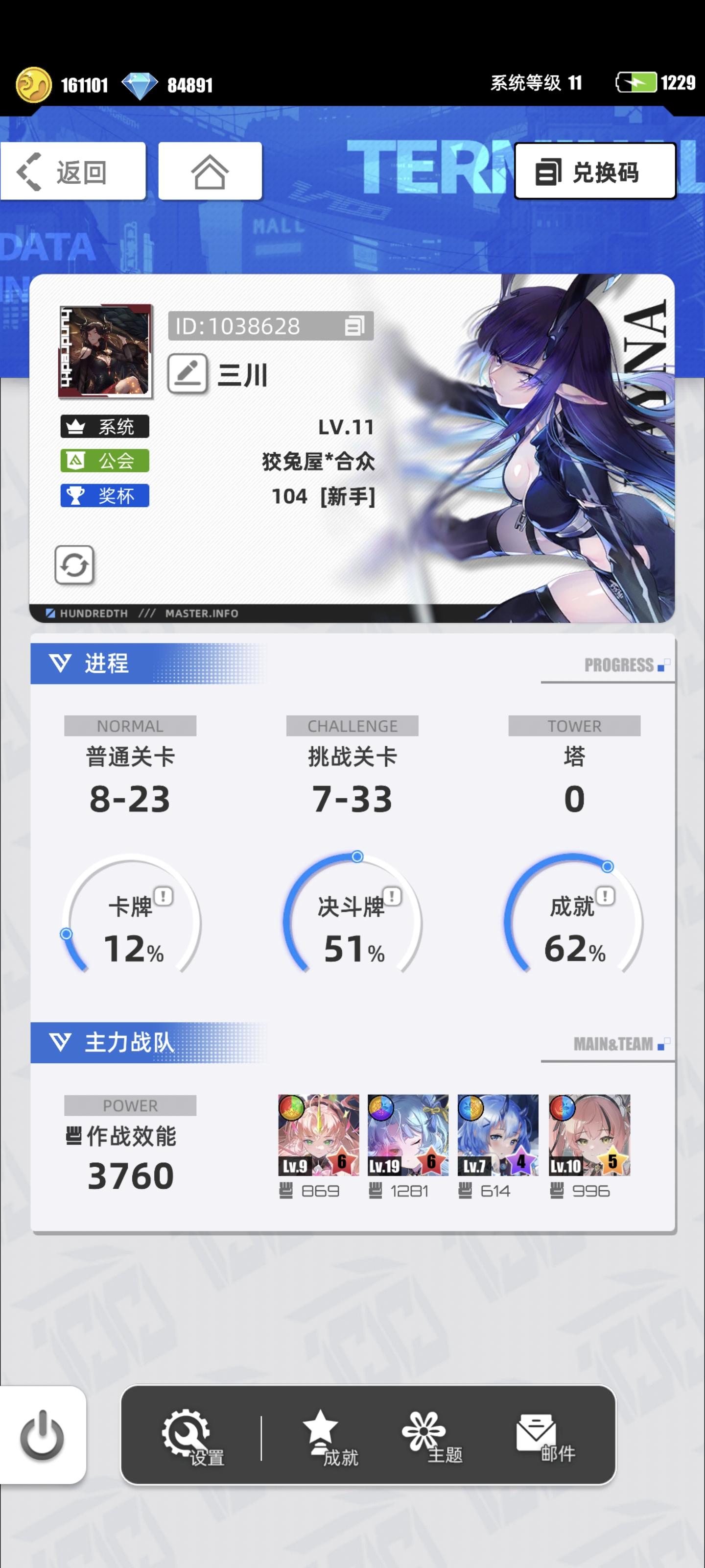 游戏名称:百分之一 游戏平台:TapTap 游戏时长:一周 适合人群:上班党、休闲党 游戏体验:抽卡资源很多,而且爆率还很高,立绘很好看,玩法简单,既没有pvp压力,也没有推图压力,工作休闲之余的好选择,适合工作摸鱼。 许愿四星卡牌:破晓天狼·克劳迪娅 游戏名称: 三川 帐号ID:1038628