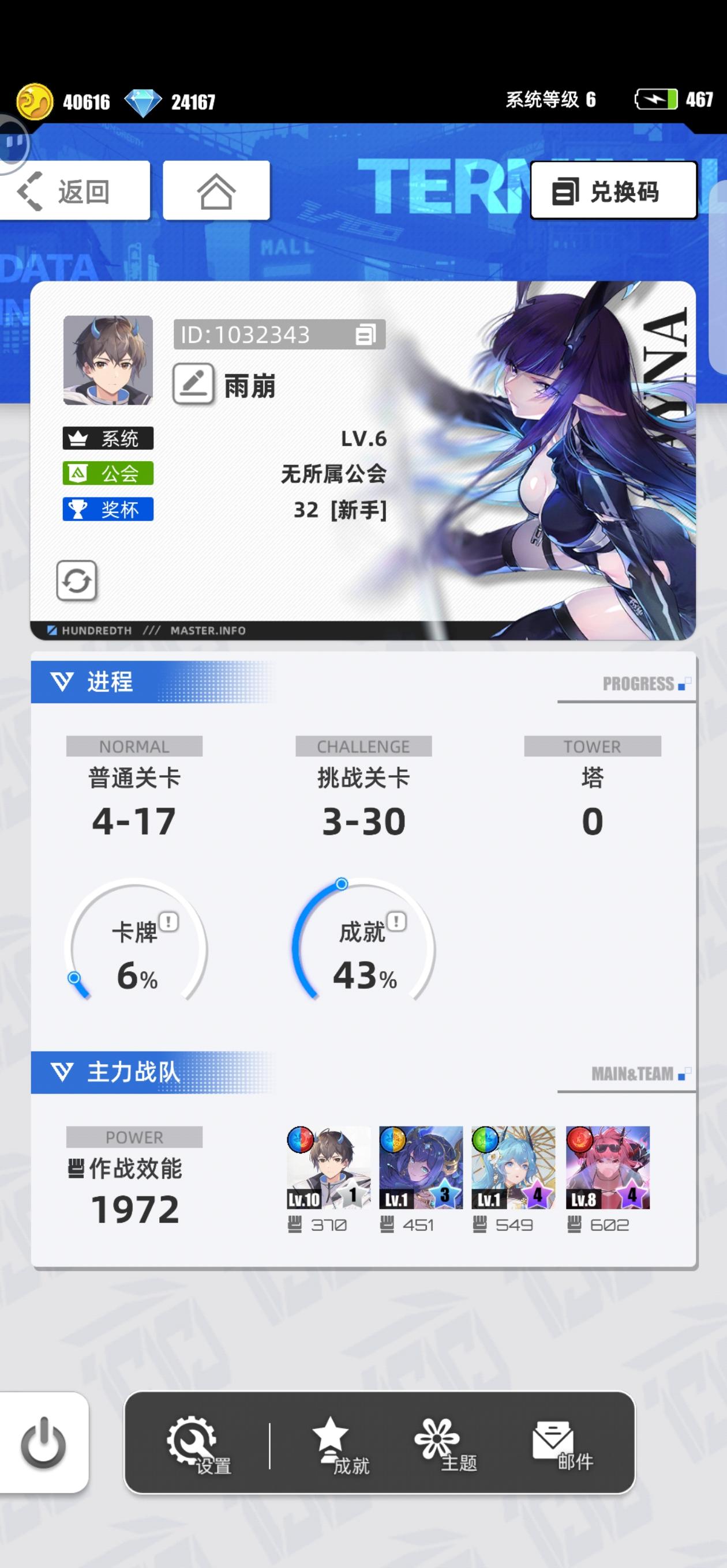 游戏名称 :百分之一 游戏平台:TapTap 游戏时长:刚接触两天 适合人群:摸鱼党 游戏体验:适合摸鱼玩一会,玩不了可以开自动很方便许愿六星卡牌:代号p*冷落雪 游戏id:奶红色粉头 帐号id:1033421