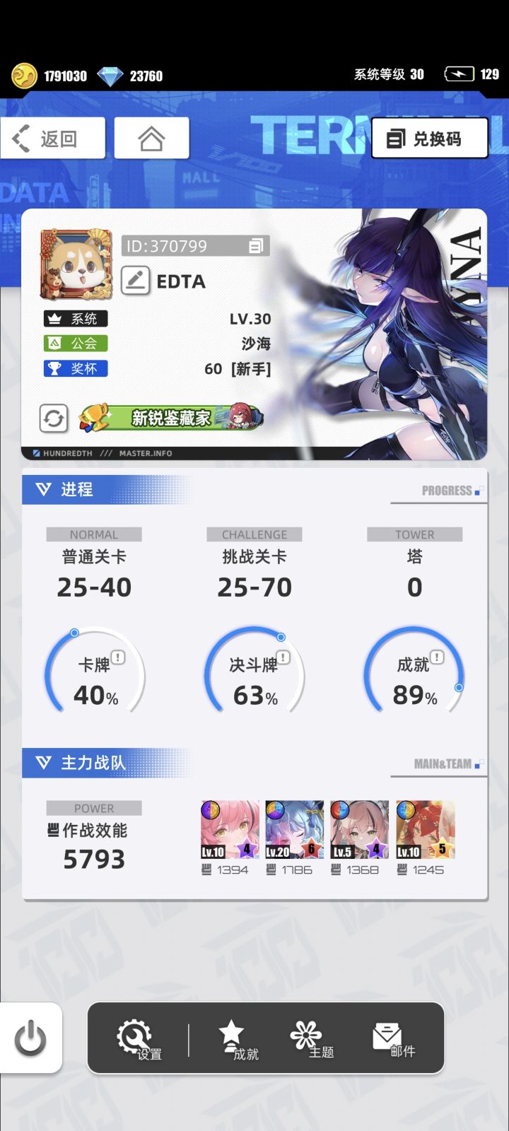 游戏名称:百分之一 游戏平台:TapTap 游戏时长:三年 适合人群:喜欢游戏内卡面,喜欢养成收集类休闲玩家 游戏体验:有公会群友还有相关频道讨论阵容搭配 ,新人可以直接抄作业。游戏内对大部分卡牌的练度要求也比较宽松,只用开关键几个天赋就ok,非常省心🍻🍻🍻 许愿六星卡牌:破晓天狼-克劳迪娅 游戏名称:EDTA 帐号ID:370799