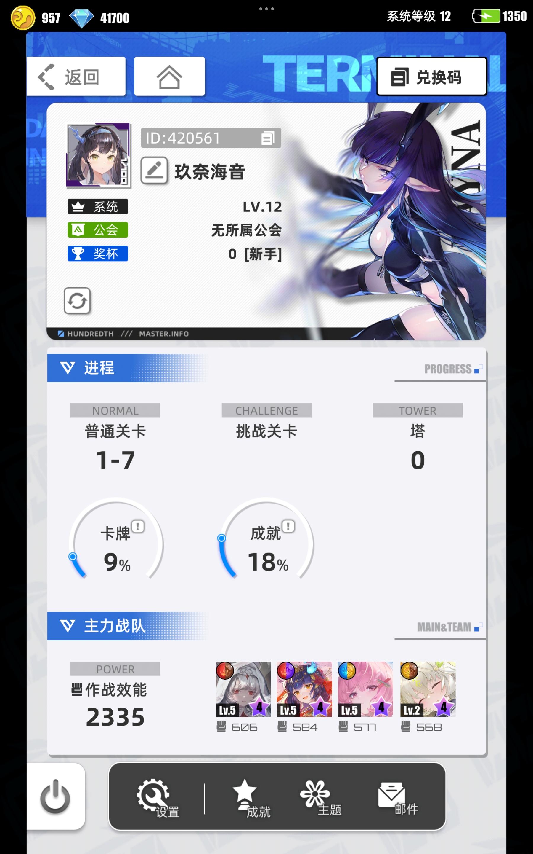 游戏名称:百分之一游戏平台:TapTap 游戏时长:刚起步适合人群:上班挂机党和养成游戏爱好者 游戏体验:竖屏游玩,适合工作之余休闲时间玩一会,比较轻松,立绘好看,可以自动游戏省事,主要失败不消耗体力且可以扫荡,对新手非常友好,期待后续体验 许愿六星卡牌:代号P*冷落雪玖奈海音 - 420561 - 安卓