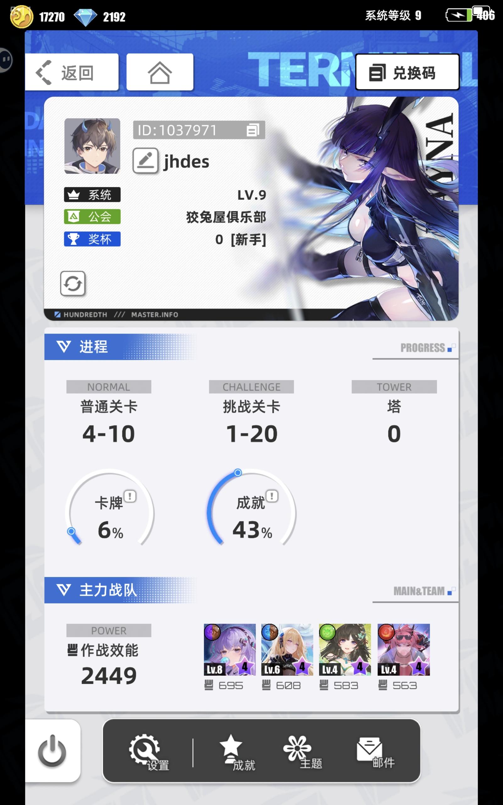 游戏名称:百分之一 游戏平台:TapTap 游戏时长:萌新玩家 以及养老玩家 适合人群:休闲党 养成游戏爱好者 摸鱼玩家 游戏体验:竖屏游戏适合作为休闲游戏,资源养成简单,角色强度压力不大,角色立绘精美,没有太大的抽卡压力,游戏剧情生动有趣,很适合有事没事的时候玩一下 很好玩 期待越做越好 许愿六星卡牌:代号P·冷落雪 游戏名称:阎良 帐号ID: 1034981