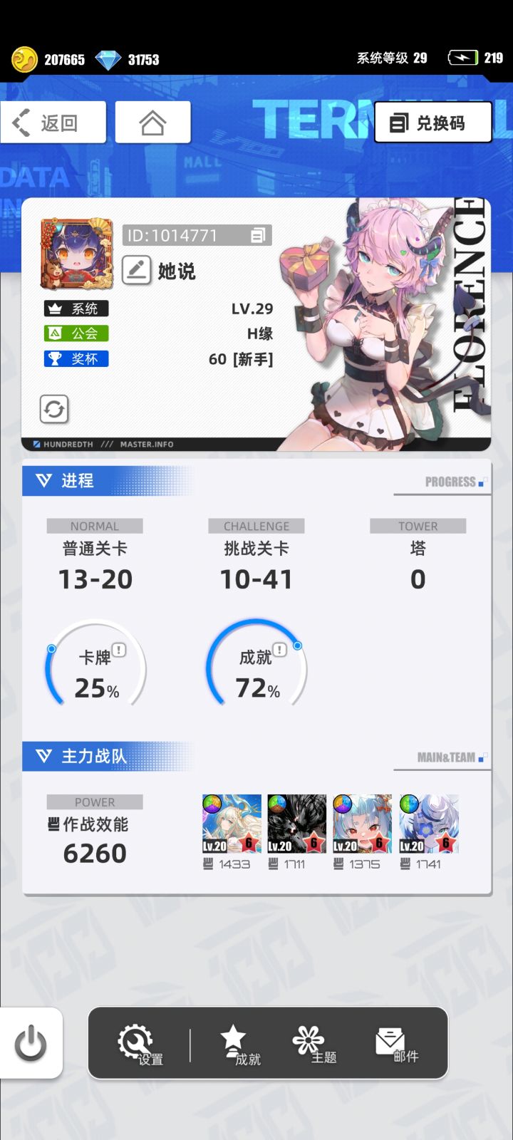 游戏名称:百分之一 游戏平台:TapTap 游戏时长:三个月 每天半小时 适合人群:零氪、微氪党、休闲党 游戏体验:游戏是一款很有创意的消消乐+二次元卡牌收集手游,收集不仅在于游戏中,现实中也可以收集实体卡,卡面都极具特色,精美、收藏感拉满。游戏玩法轻松有趣,福利良好、不逼氪不逼肝,挂机收益友好,碎片化时间也能畅玩。 许愿六星卡牌:破晓天狼*克劳迪娅游戏昵称:ccc帐号ID:1019